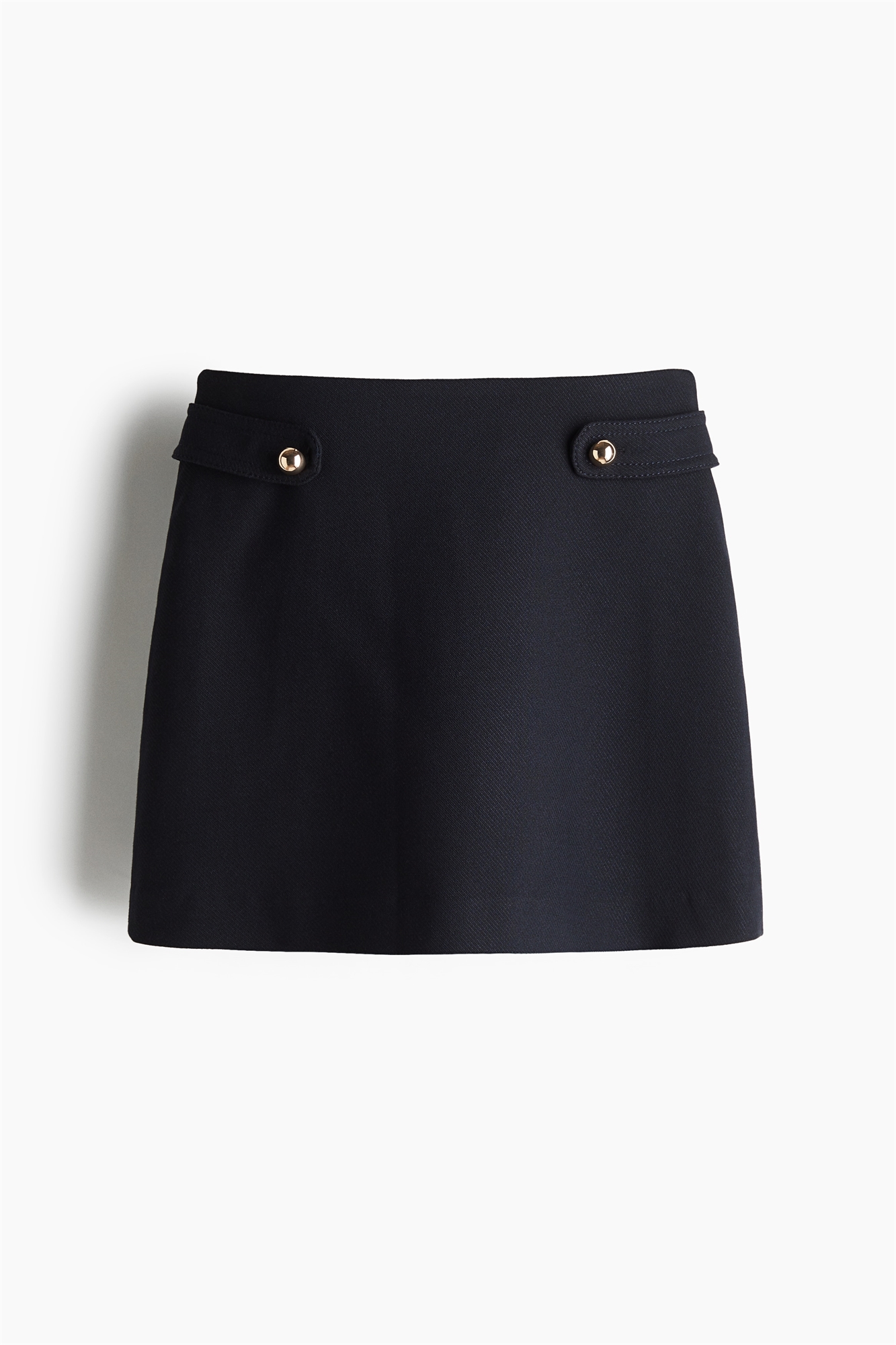 Короткая юбка А-силуэта из тканого материала с высокой талией и потайной застежкой на молнию и пуговицу сзади. Декоративные вкладки с шарообразной металлической пуговицей с каждой стороны. На подкладке.