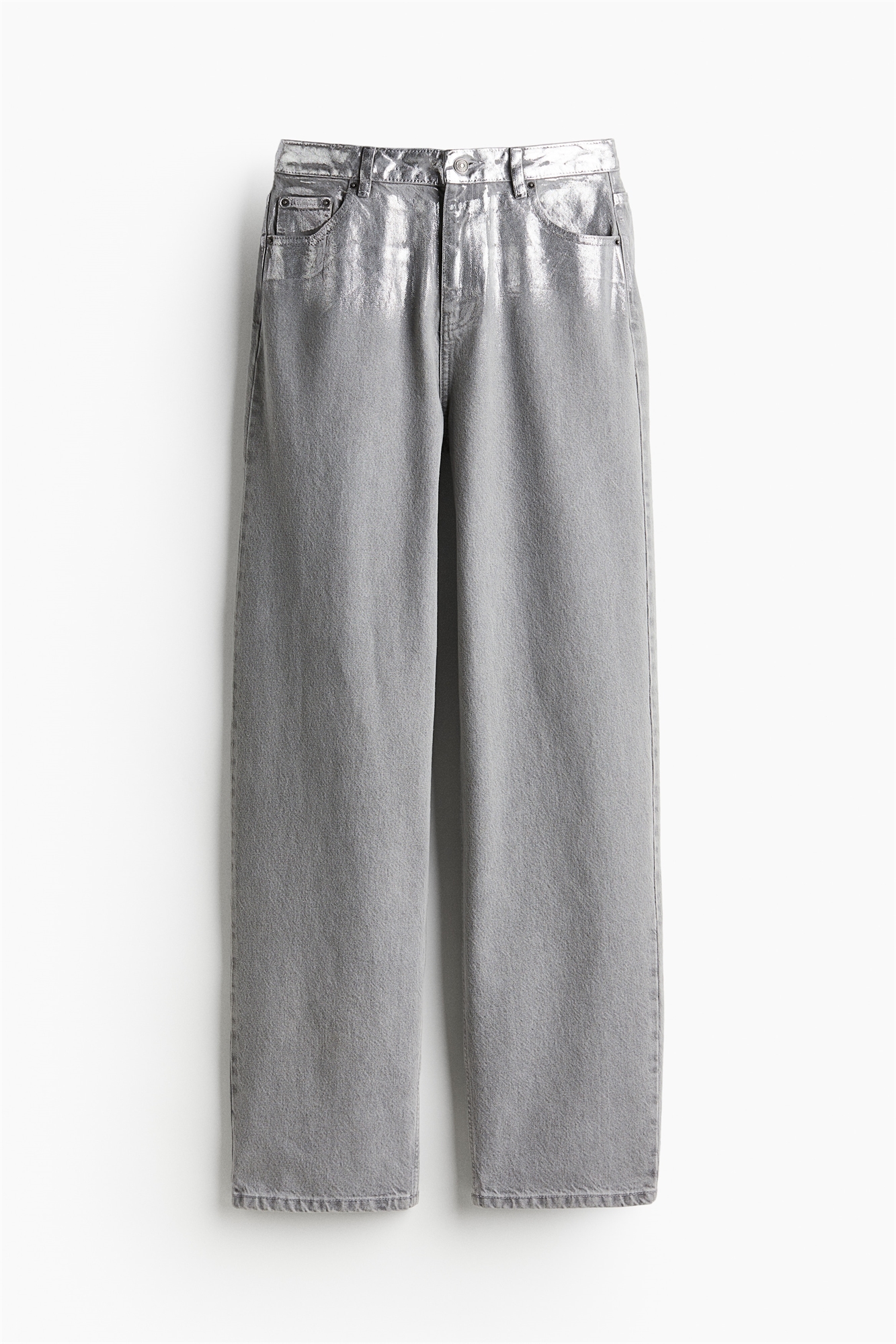 ROTATE H&M. Джинсы с 5 карманами из жесткого хлопкового денима с мерцающим металлическим покрытием в верхней части для смелого образа. Джинсы украшены заклепками в форме сердца спереди. Широкие штанины с зауженной посадкой от талии до бедер и широким кроем от бедра до подола. Регулярный пояс с ширинкой на молнии и пуговице. Вышитый логотип бренда на одном заднем кармане.