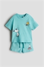 Хлопковый комплект из футболки из мягкого трикотажа и пары шорт из легкой толстовочной ткани. Футболка с принтом, спущенными плечами и круглым вырезом с ребристой отделкой и застежками с одной стороны (кроме размеров 2-4Y). Шорты с эластичным утягивающим поясом.