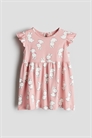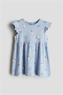 Платье из мягкого хлопкового джерси с принтом, круглым вырезом, застежкой на пуговицу сзади и рукавами-воланами. Присборенная талия и расклешенная юбка.