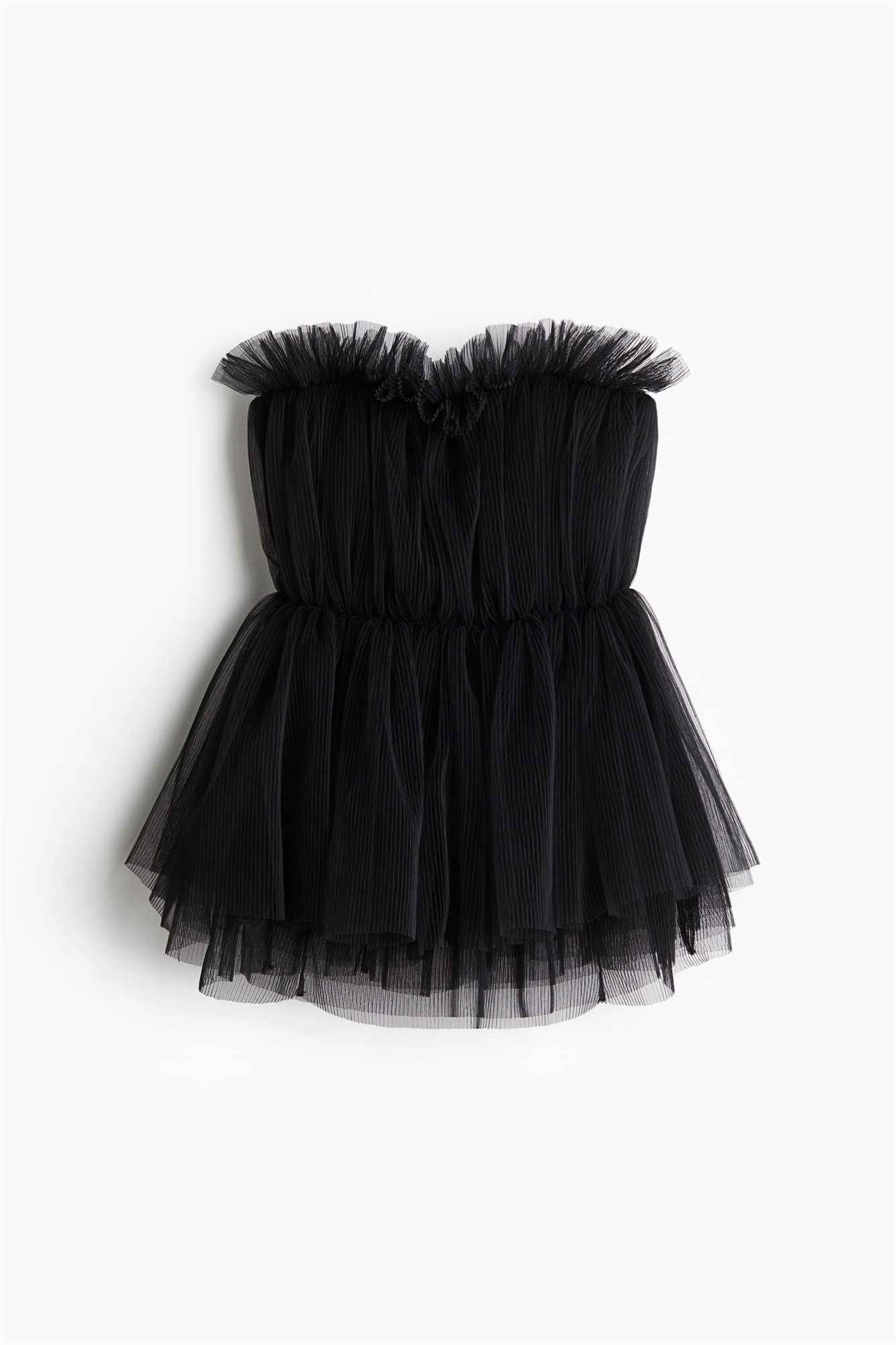 Топ-бандо из плиссированного тюля с вырезом, отделанным оборками, косточками спереди для придания формы и поддержки и скрытой силиконовой отделкой в верхней части. Сборчатый шов на талии и расклешенная нижняя часть из нескольких слоев. Скрытая застежка-молния и застежка-крючок с одной стороны. Частично на подкладке.