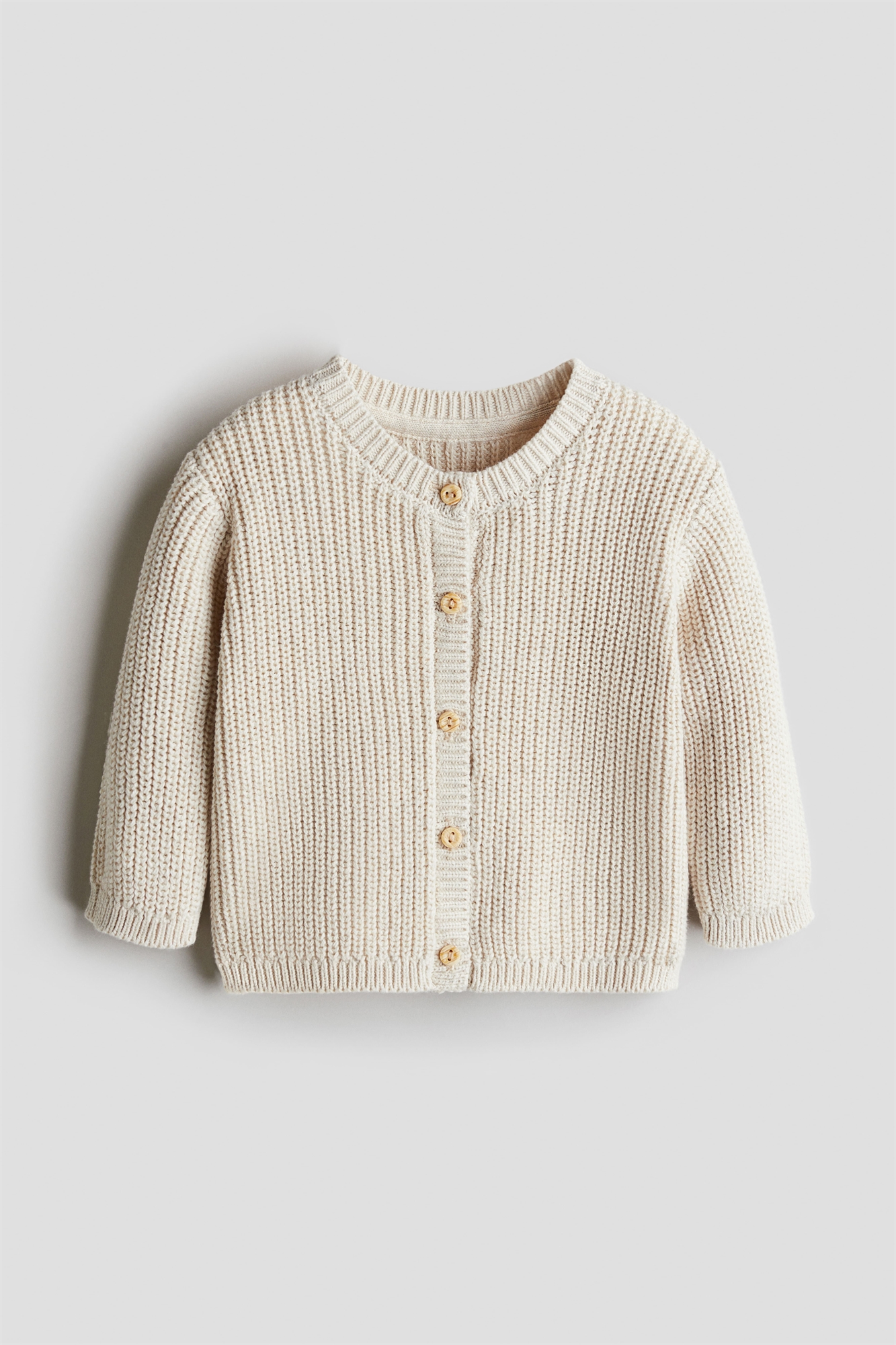Кардиган из лакированного трикотажа с круглым вырезом, пуговицами спереди и спущенными плечами. Ребристые манжеты и подол.