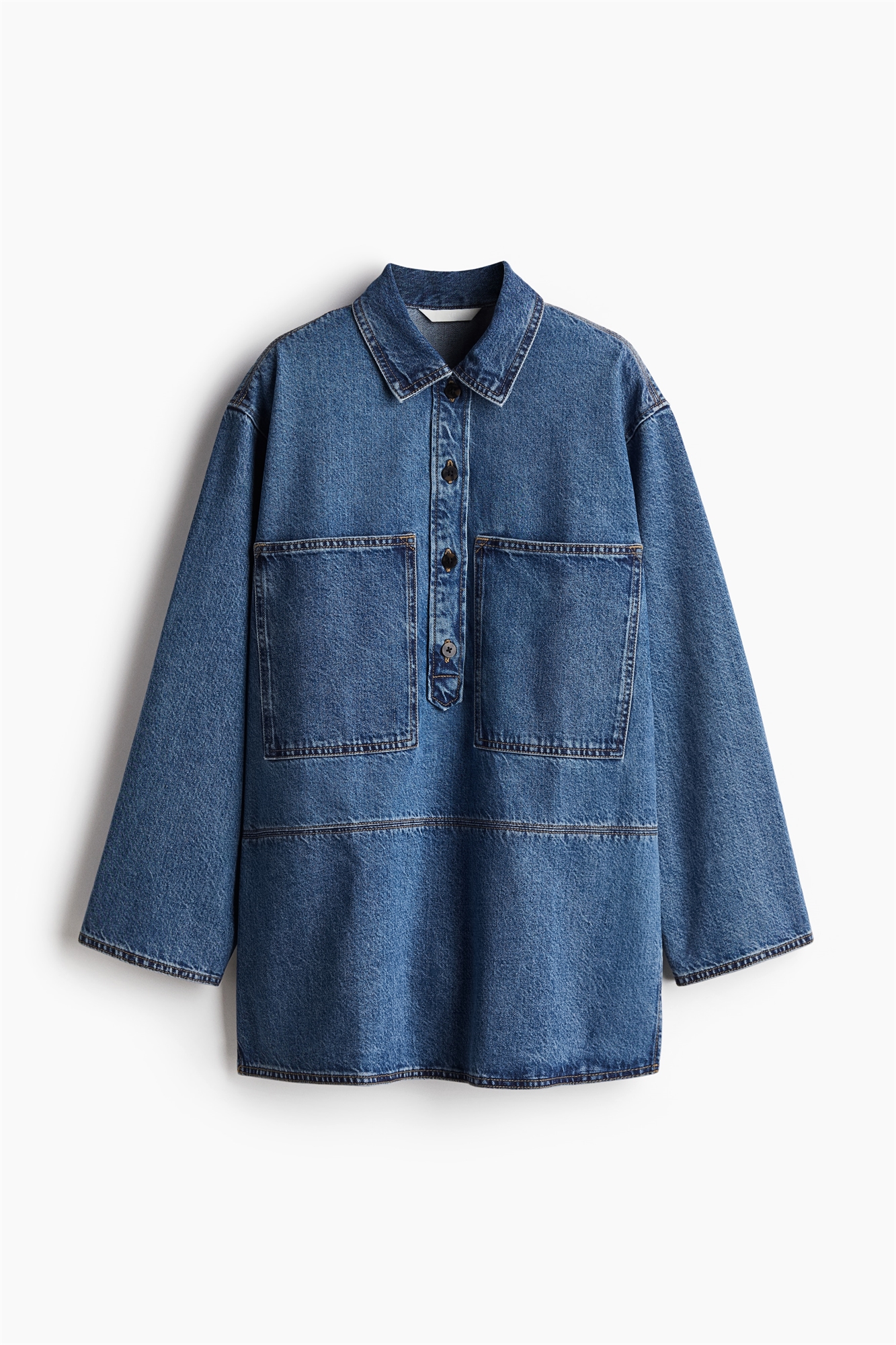 Длинная рубашка-поповер из хлопка и лиоцелла с воротником и застежкой на пуговицах. Свободный крой с большими нагрудными карманами, спущенными плечами и длинными рукавами. Шов на бедрах и прямой подол с высоким разрезом с каждой стороны.
