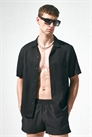 Шорты для плавания из тканого материала с эластичным покрытием и скрытым шнурком на талии, боковыми карманами и небольшим разрезом по бокам. Внутренние шорты из сетки.