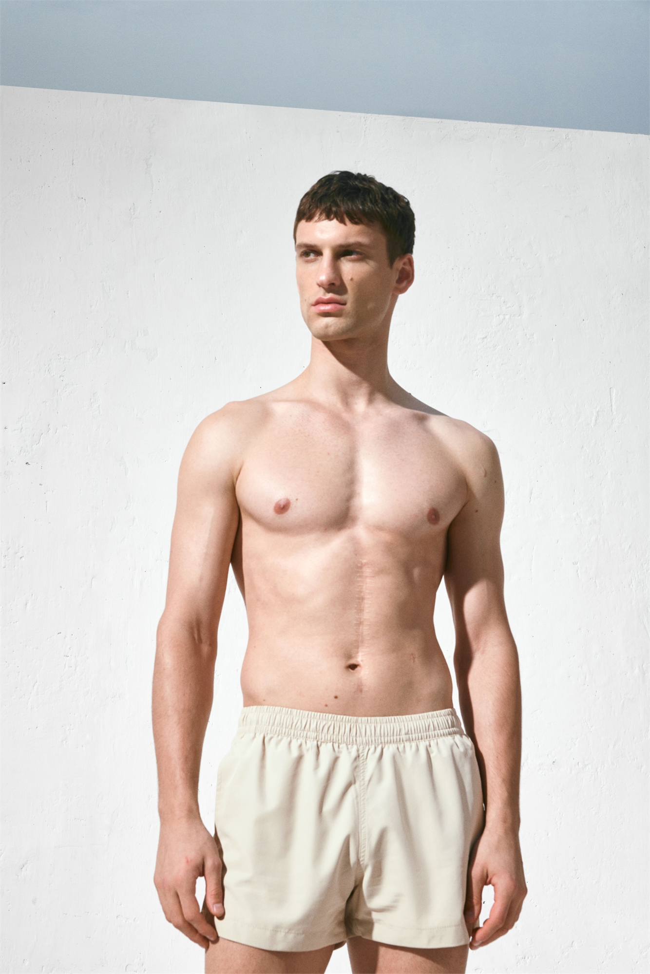 Шорты для плавания из тканого материала с эластичным покрытием и скрытым шнурком на талии, боковыми карманами и небольшим разрезом по бокам. Внутренние шорты из сетки.