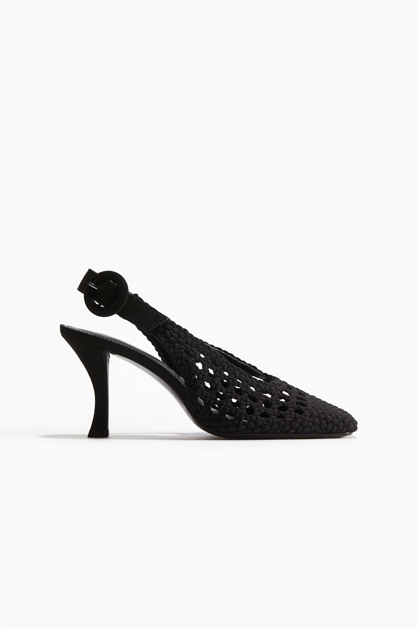 Туфли на каблуке из плетеного хлопкового холста с квадратным носком и регулируемым ремешком на пятке с круглой пряжкой. Частично закрытый каблук.