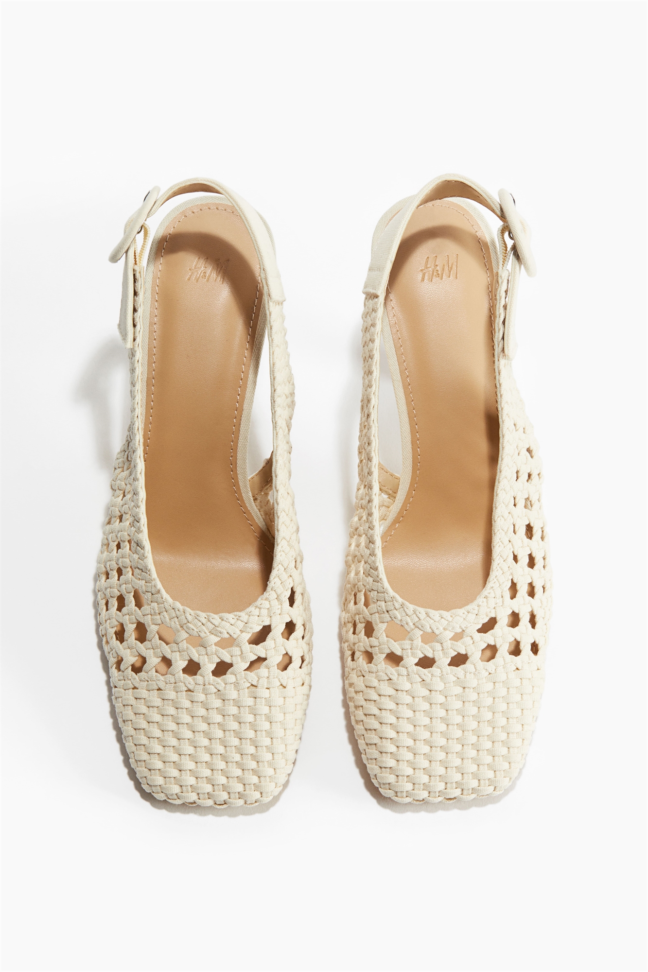 Туфли на каблуке из плетеного хлопкового холста с квадратным носком и регулируемым ремешком на пятке с круглой пряжкой. Частично закрытый каблук.
