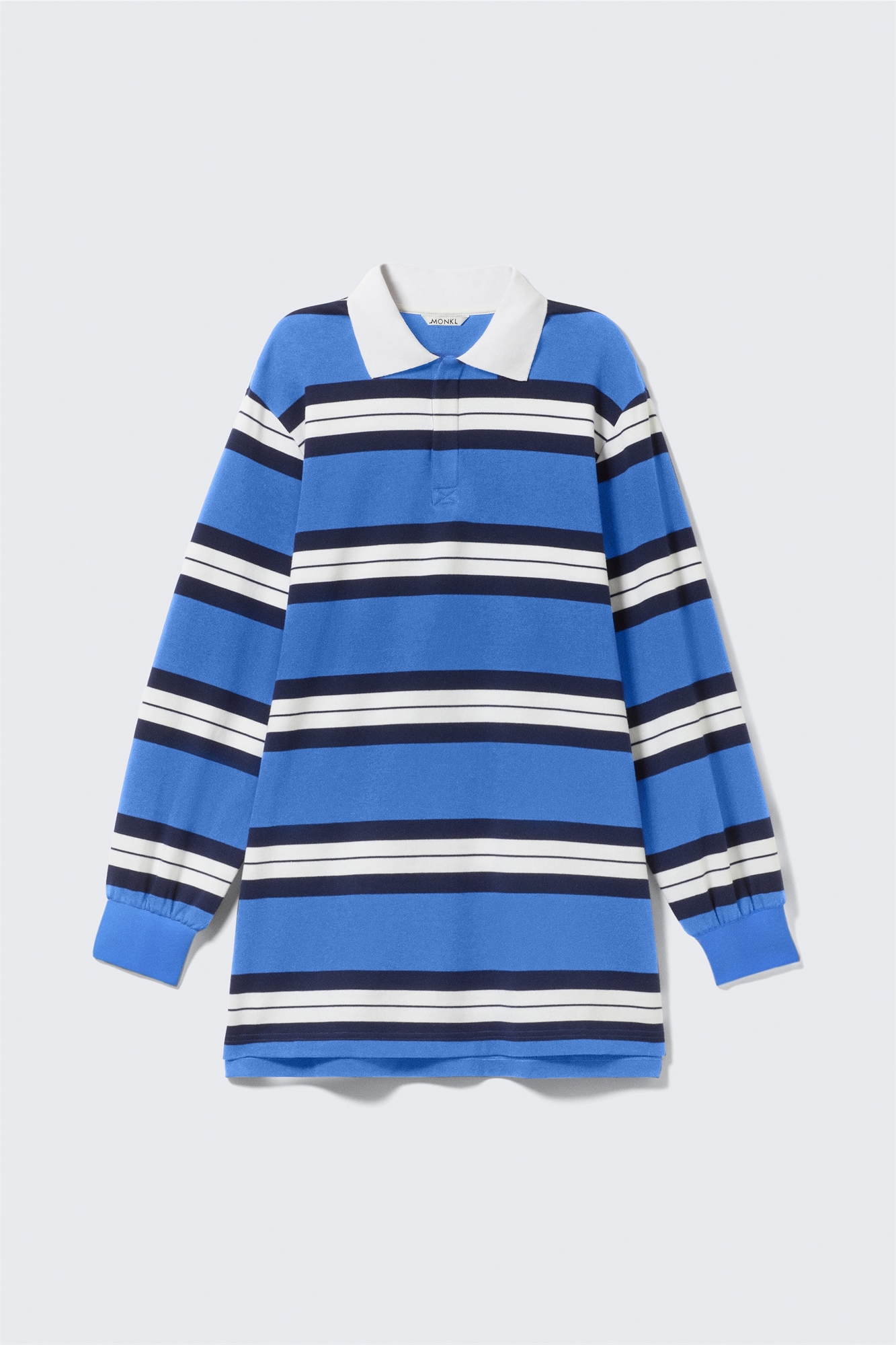 Короткое платье с длинными рукавами в стиле регби, свободного покроя. Классический вырез-поло с застежкой на пуговицы и ребристые манжеты. Свободный крой. Короткая длина. Вырез поло. Застежка на пуговицы. Рифленые манжеты.