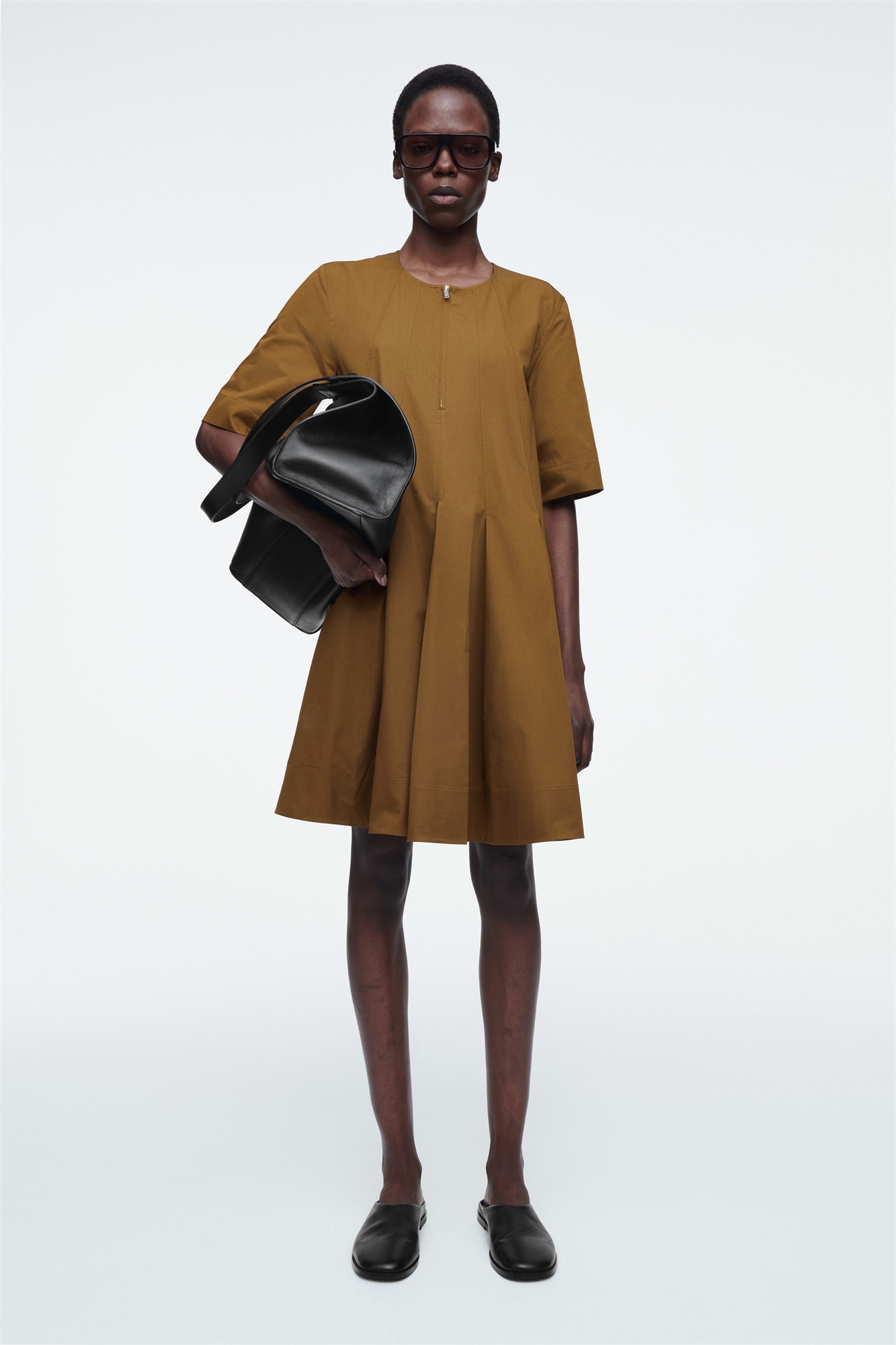 Это изысканное платье с простроченными панелями, переходящими в складки. Оно сшито из мягкого хлопка терракотового оттенка и застегивается на серебристую молнию, имеет короткие рукава и незаметные боковые карманы. Regular fitЗастежка на молнию Материал: 100% хлопок. Без учета отделки / Машинная стирка Длина по спинке для размера EU 36 составляет 89,5 см / Модель носит размер EU 36
