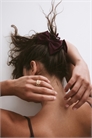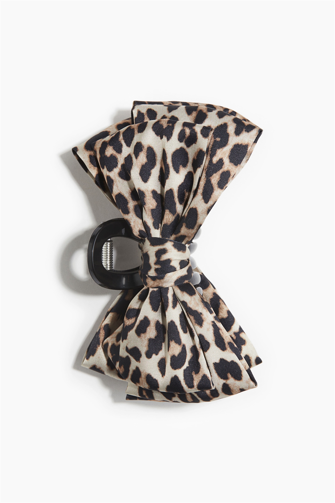 Пластиковый когтеточка для волос, украшенная тканевым бантиком с каждой стороны.