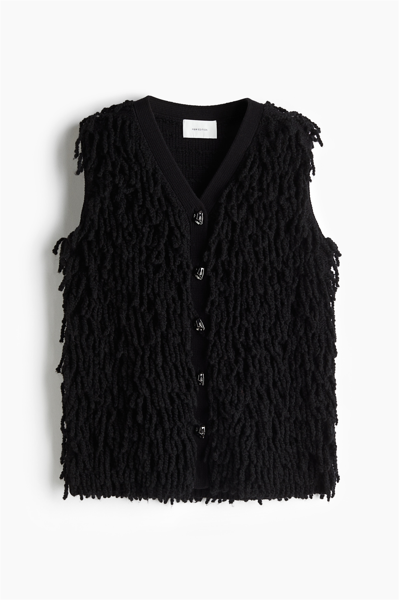 Свободный свитер-жилет из мягкого трикотажного шерстяного микса, покрытого слоями короткой бахромы. V-образный вырез, асимметричные пуговицы спереди и тесемки вокруг выреза и по низу пуговиц.