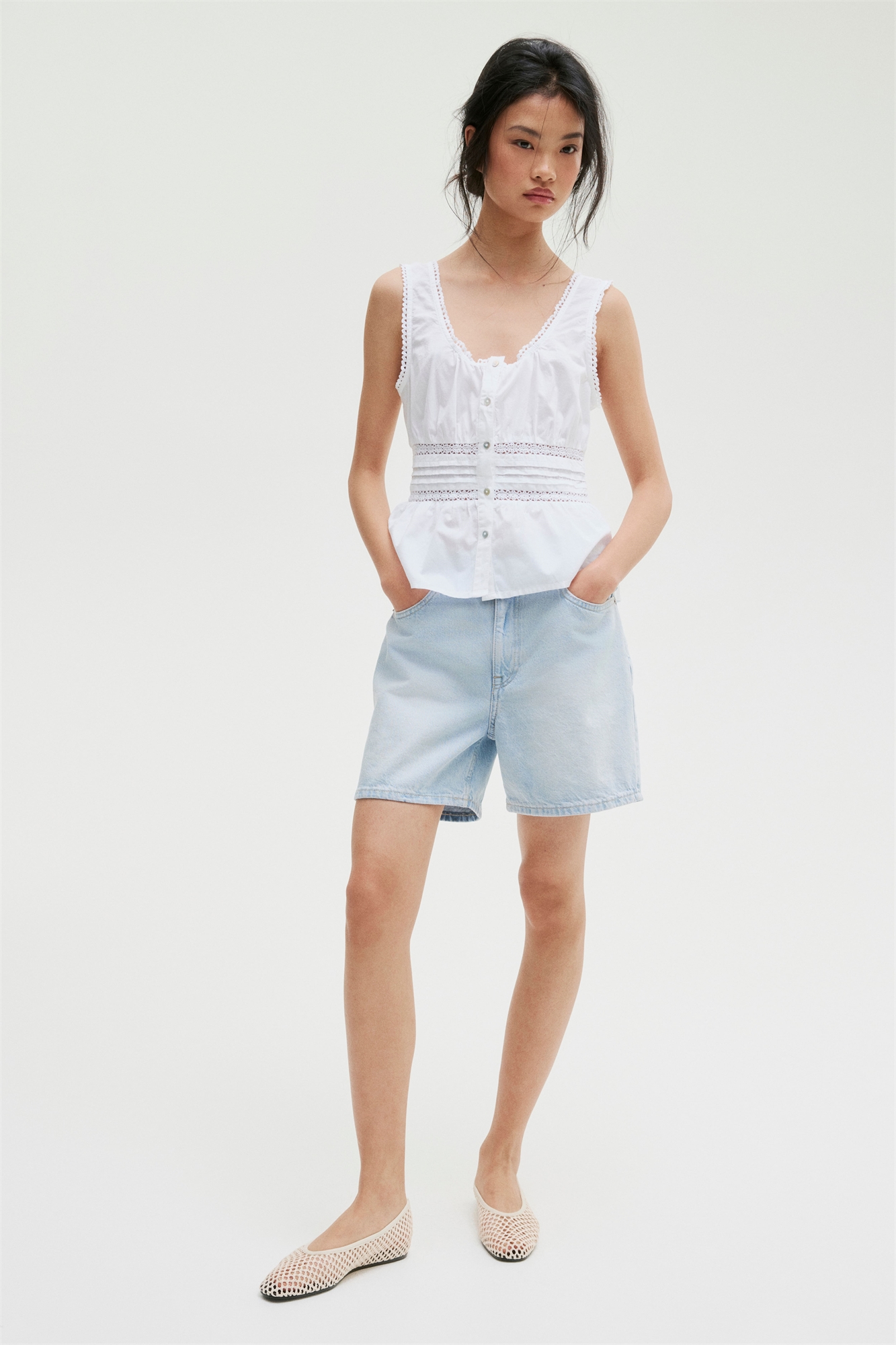 Шорты с 5 карманами из плотного хлопкового денима с высокой талией, застежкой на молнию и пуговицу.