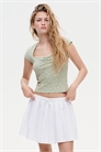 Короткий приталенный топ из узкого ребристого хлопкового джерси с вырезом в форме сердца и тонкой отделкой пико. Присборенный шов по центру бюста, рукава-капельки и прямой подол.