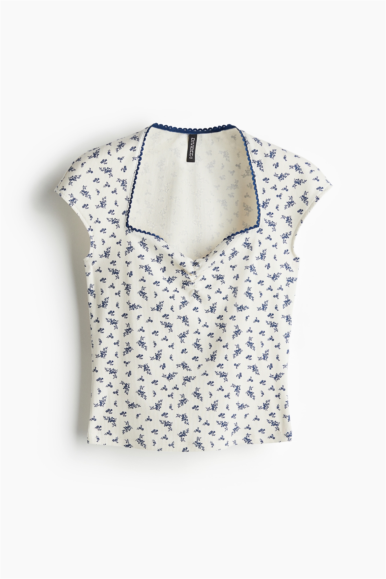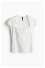 Короткий приталенный топ из узкого ребристого хлопкового джерси с вырезом в форме сердца и тонкой отделкой пико. Присборенный шов по центру бюста, рукава-капельки и прямой подол.