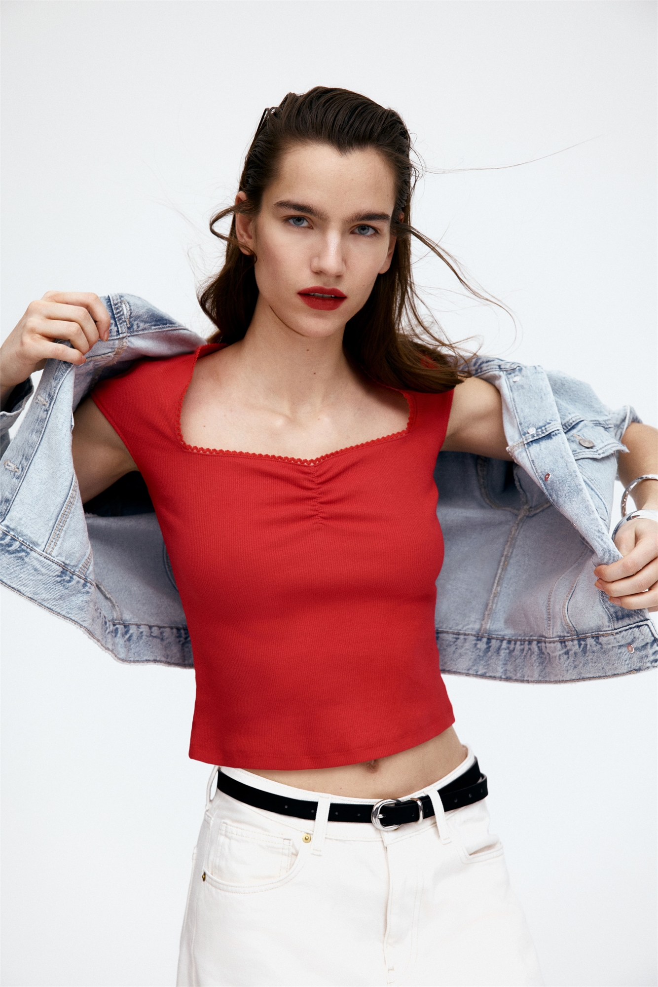 Короткий приталенный топ из узкого ребристого хлопкового джерси с вырезом в форме сердца и тонкой отделкой пико. Присборенный шов по центру бюста, рукава-капельки и прямой подол.