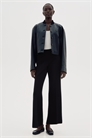 Брюки из тканого материала с заниженной талией и потайной застежкой на молнию и пуговицу с одной стороны. Вытачки и втачные карманы сзади. Ноги со складками спереди и сзади и мягким расклешением от коленей до подола.