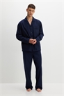 Пижама с рубашкой и нижними штанишками из мягкого хлопкового полотна. Рубашка с длинными рукавами, закругленным воротником, застежкой на пуговицы спереди, накладным нагрудным карманом и накладными передними карманами. Подол прямого кроя с разрезом с каждой стороны. Низ с эластичной талией, фальшивой ширинкой и диагональными боковыми карманами.