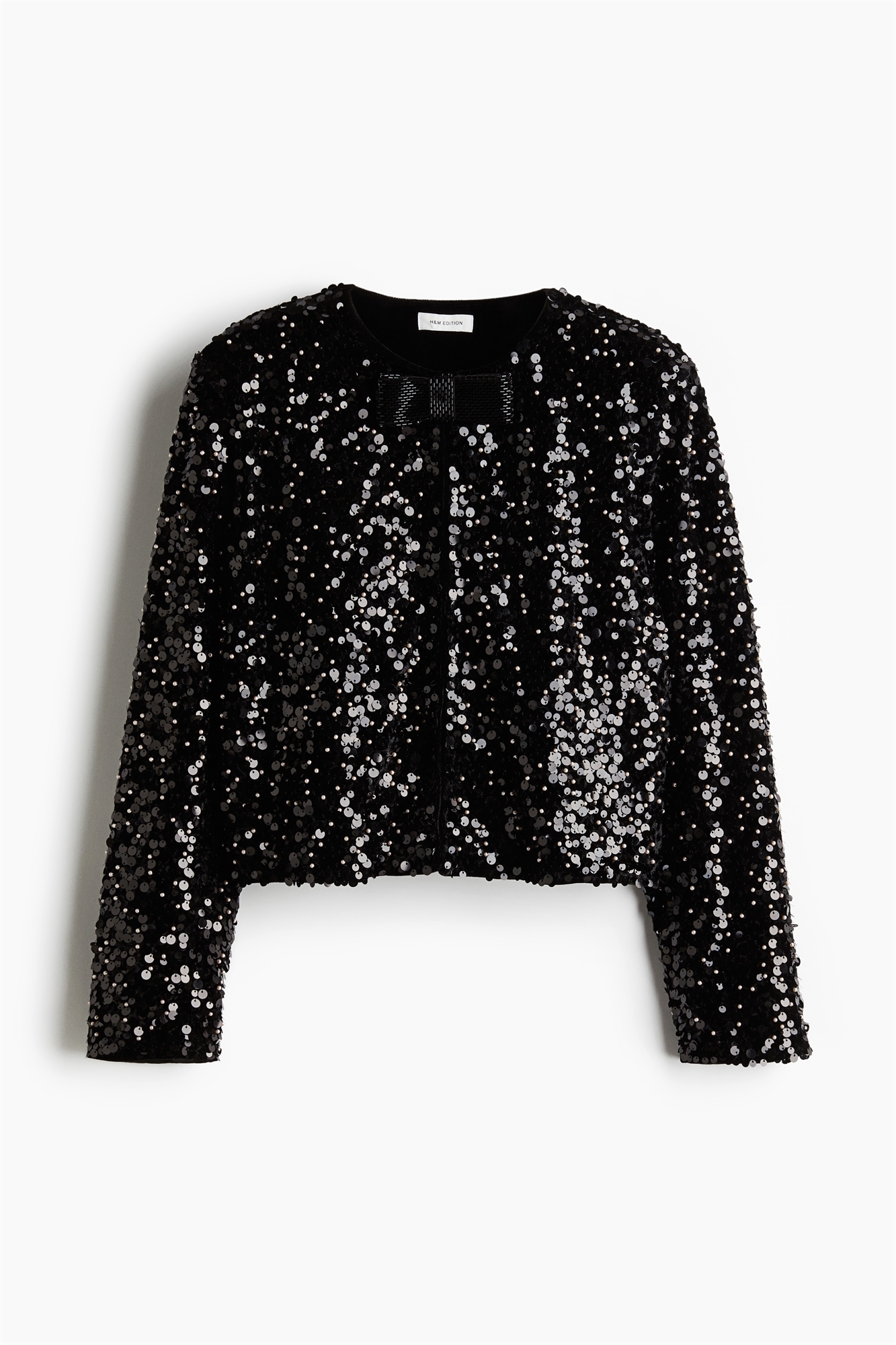Жакет из блестящего велюра с круглым вырезом и декоративным бантом из бисера спереди. Плечевые накладки, длинные рукава и застежки-крючки спереди. Подкладка из джерси.