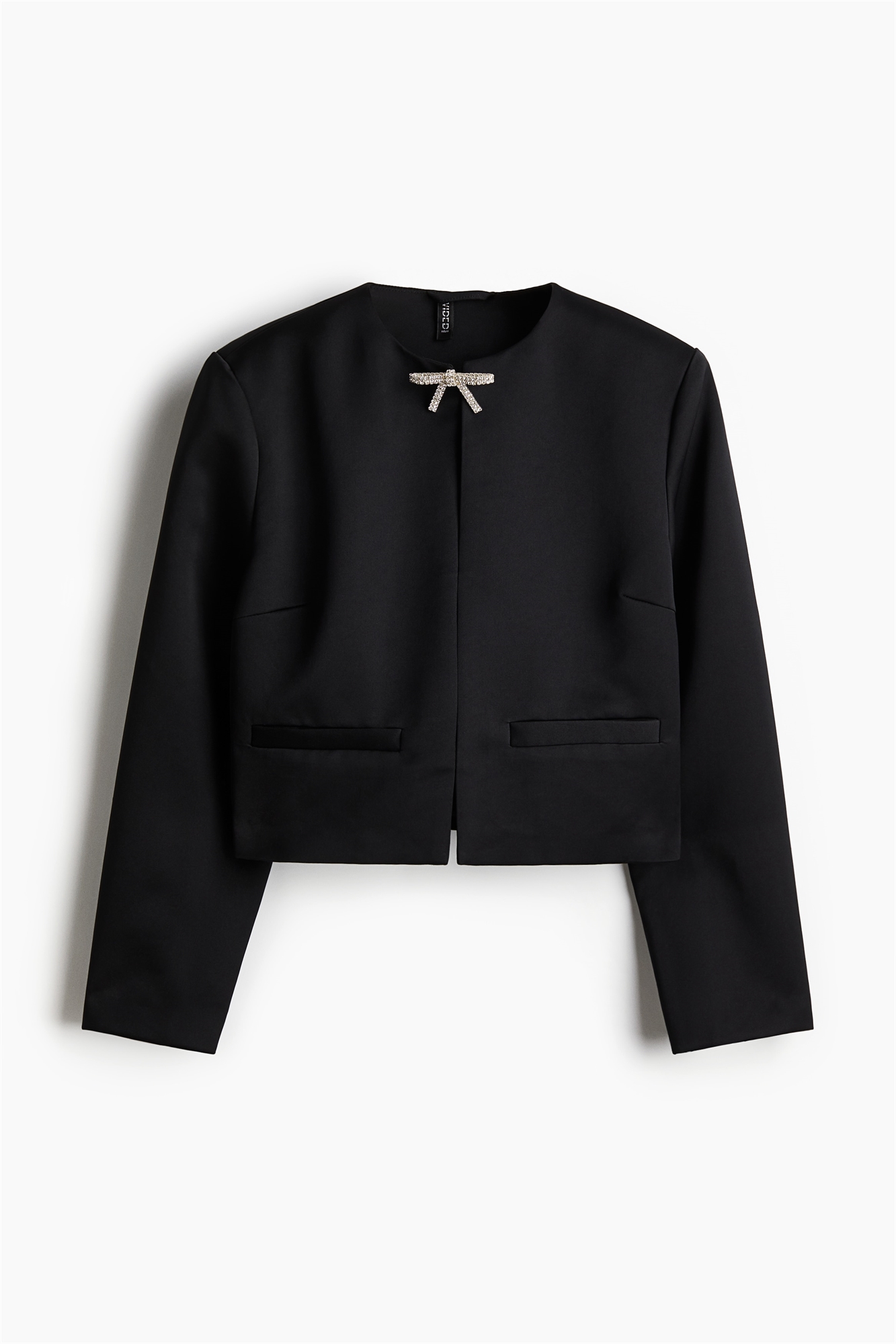 Короткий приталенный жакет из тканого материала с круглым вырезом и декоративным бантом, украшенным стразами, спереди. Скрытые застежки-крючки спереди и прорезные передние карманы. На подкладке.
