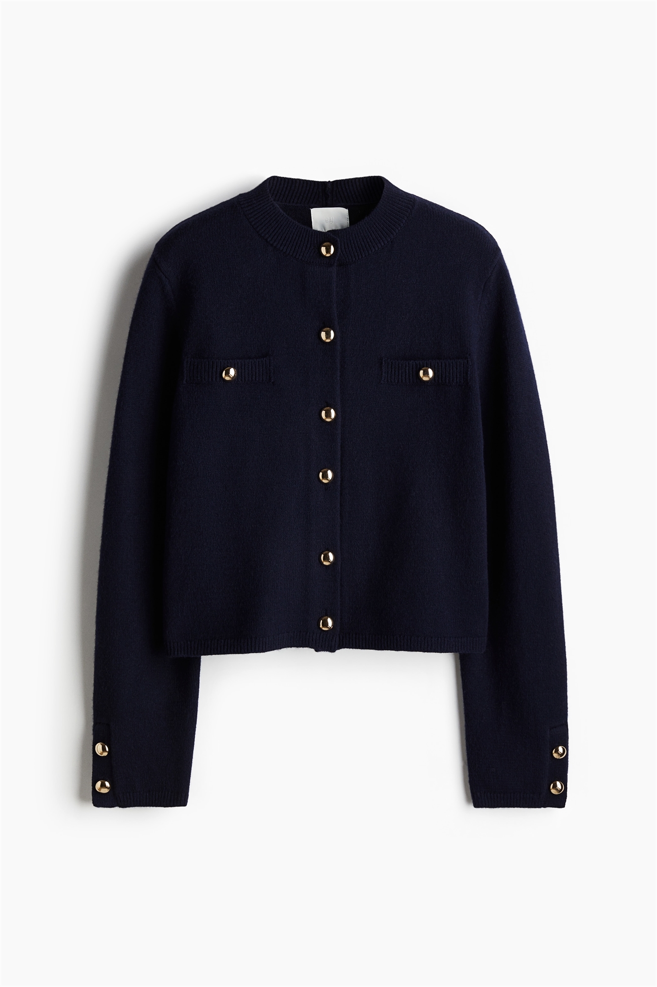 Короткий кардиган из плотного трикотажа с ребристым воротником-стойкой и сферическими металлическими пуговицами спереди. Нагрудные карманы с пуговицей и длинные рукава с пуговицами на манжетах.