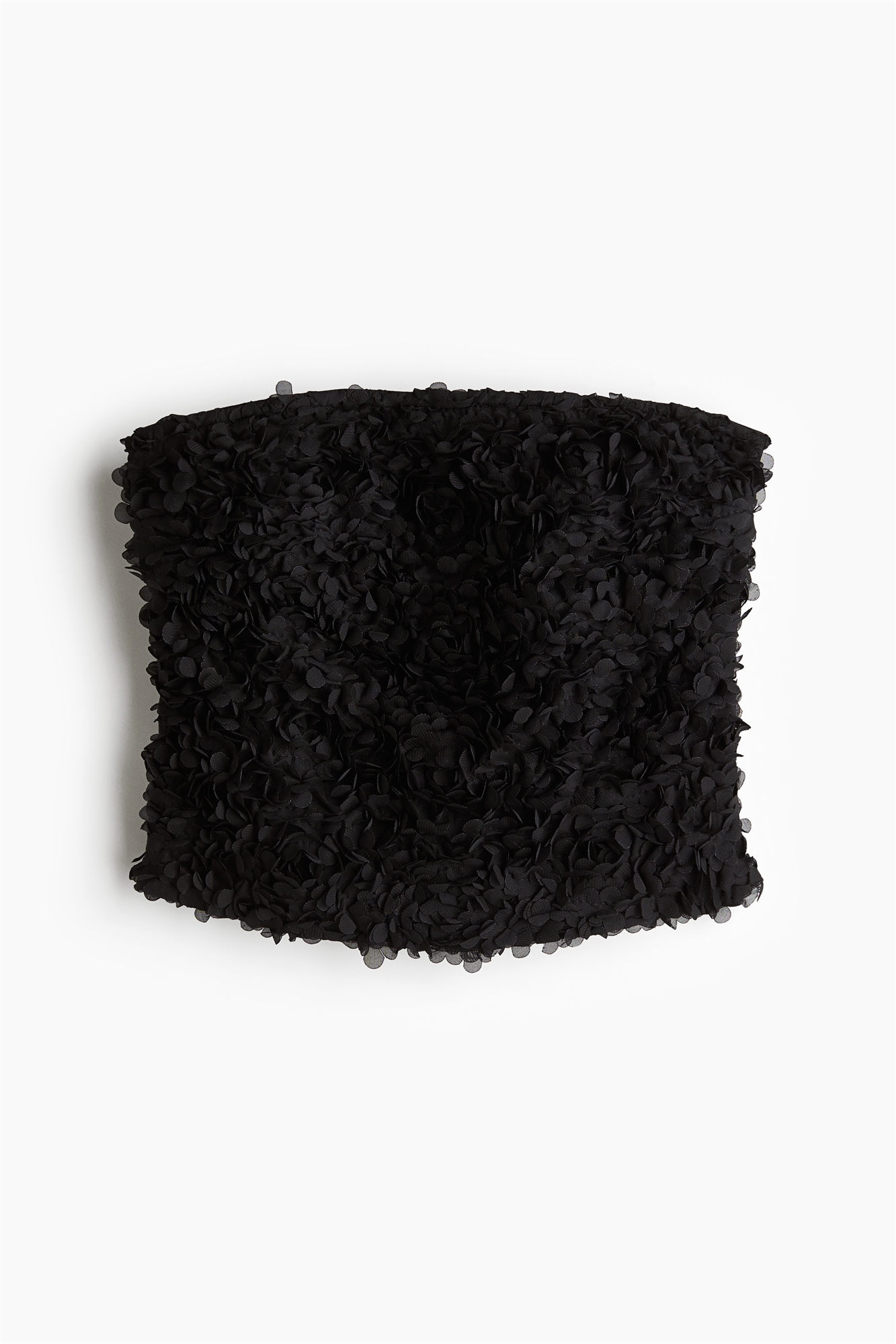Короткий топ-бандо из аппликационной сетки с потайной застежкой-молнией с одной стороны и силиконовой окантовкой в верхней части для фиксации на месте. Подкладка из джерси.