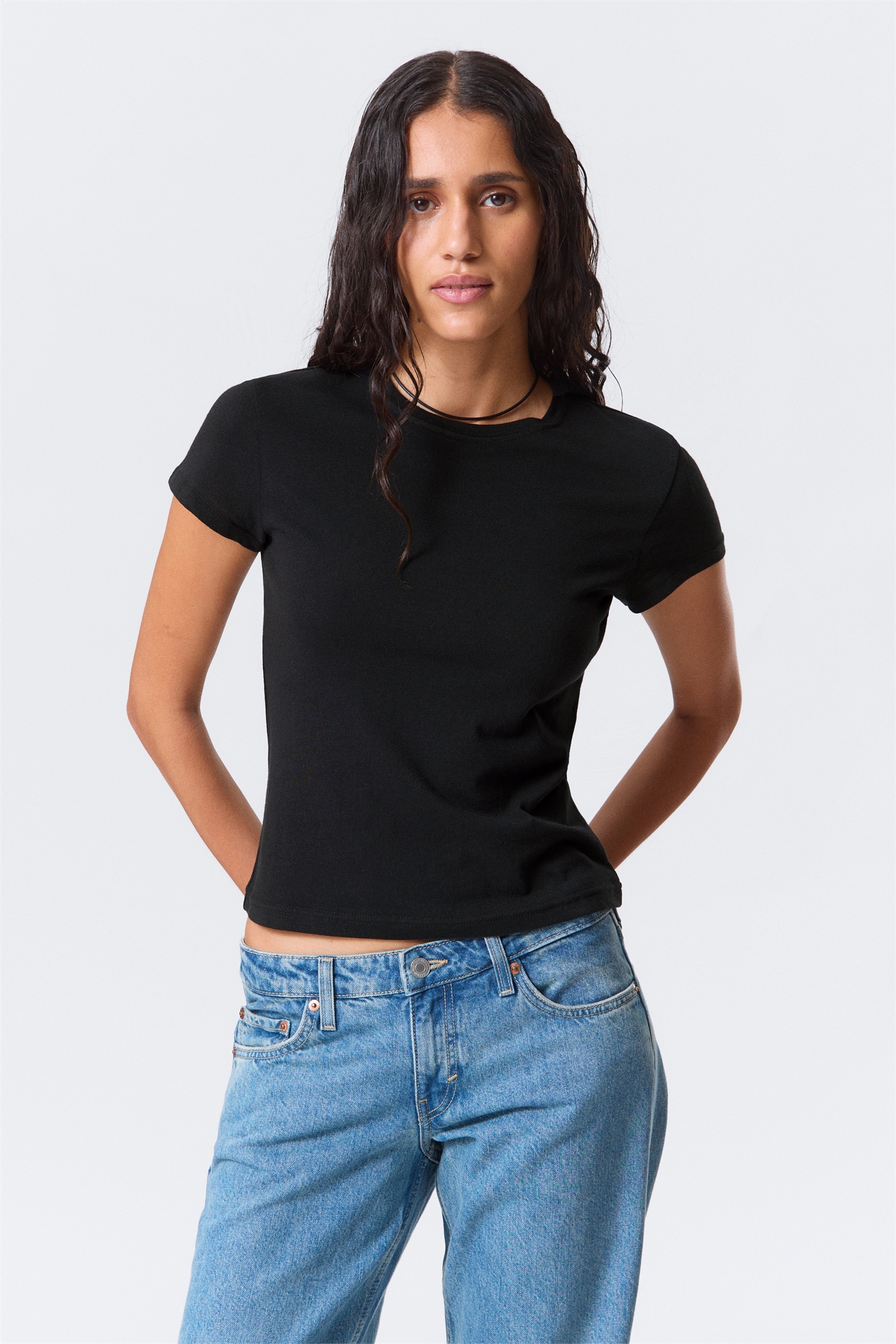 Нестареющая футболка с вырезом горловины изготовлена из мягкого хлопкового джерси и имеет зауженный крой. Модель имеет классический крой, короткие рукава и отделку из двух иголок по подолу и вырезу горловины.