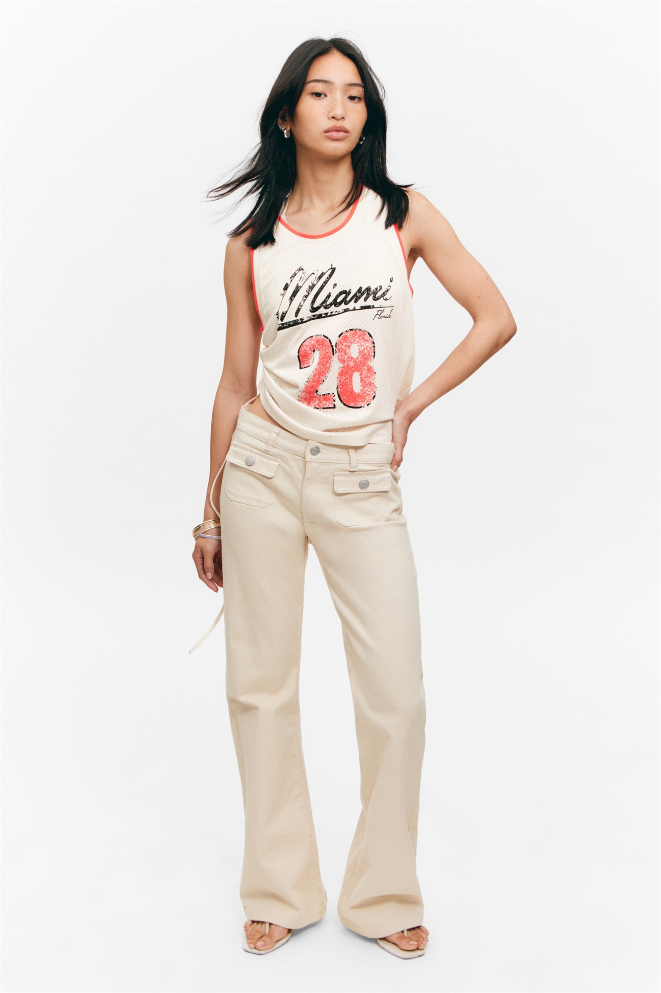 Брюки из эластичной саржи с заниженной талией и посадкой bootcut. Ширинка на молнии, передние накладные карманы с кнопками и задние карманы. Зауженный крой. Заниженная талия. Обрезанная штанина. Ширинка на молнии. Накладные карманы. Задние карманы. Эластичная саржа.