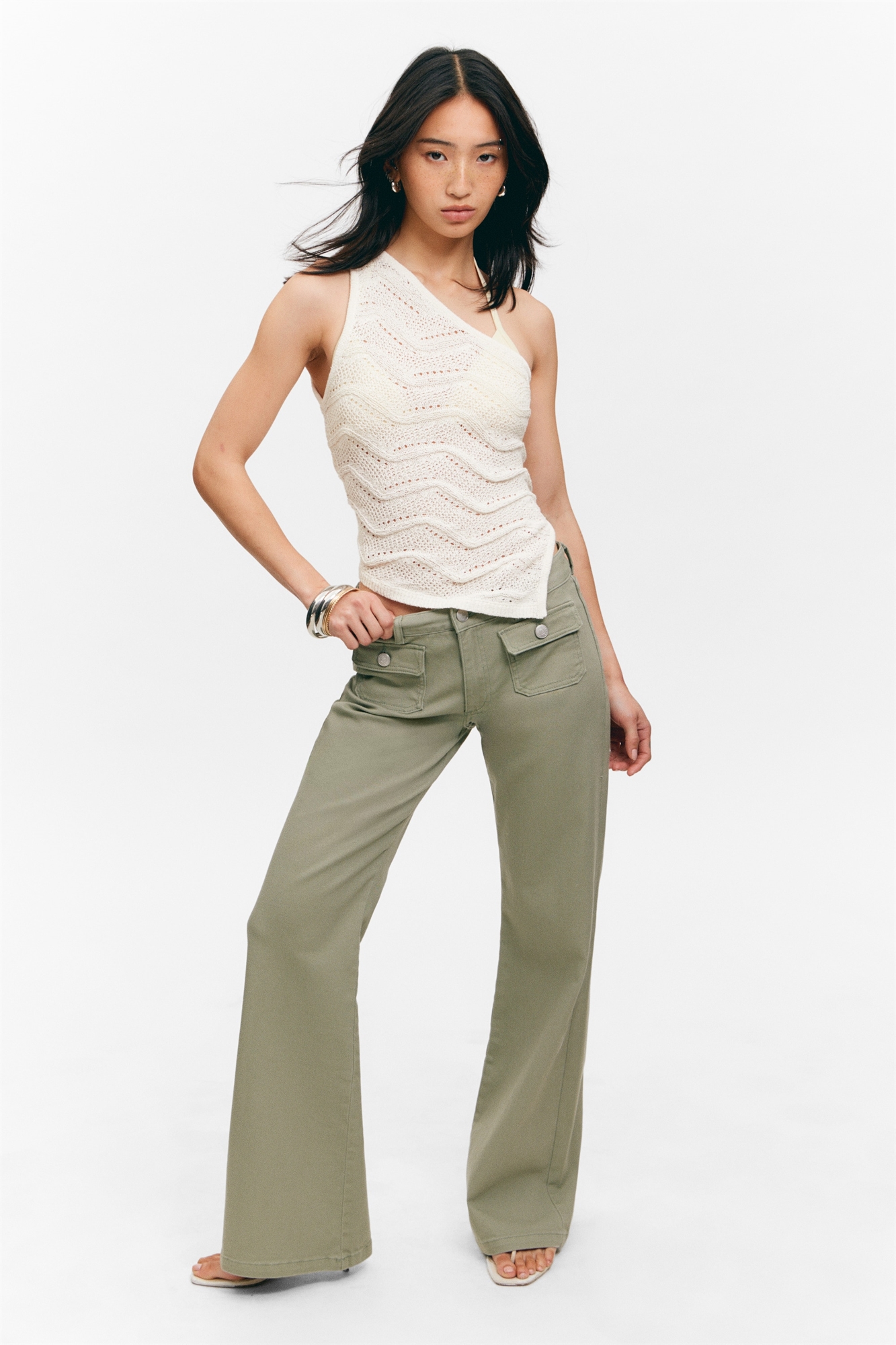 Брюки из эластичной саржи с заниженной талией и посадкой bootcut. Ширинка на молнии, передние накладные карманы с кнопками и задние карманы. Зауженный крой. Заниженная талия. Обрезанная штанина. Ширинка на молнии. Накладные карманы. Задние карманы. Эластичная саржа.