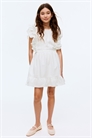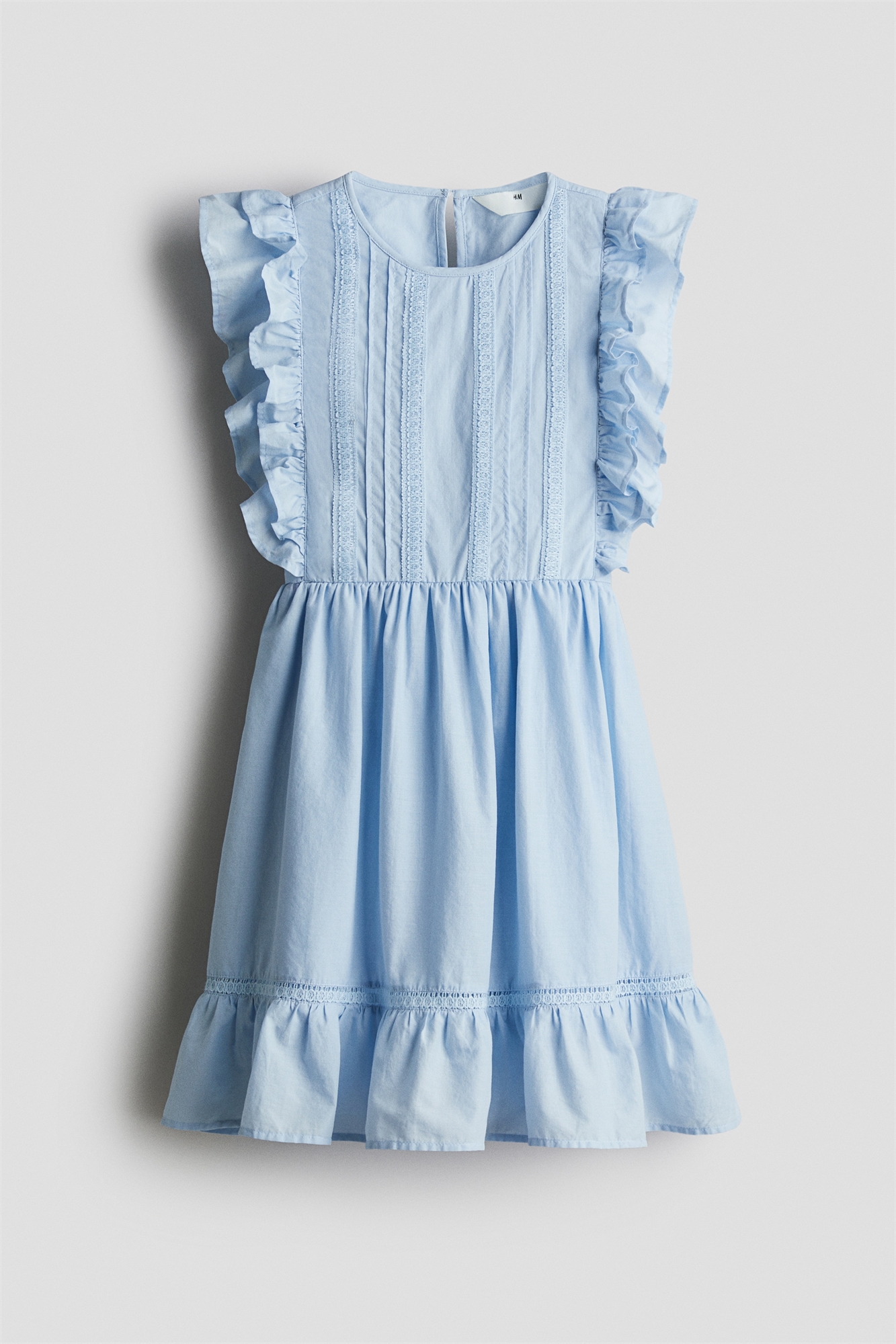 Платье без рукавов из мягкого, воздушного хлопкового полотна с воланами и кружевными деталями. Круглый вырез, двухслойные оборки спереди, переходящие на плечи, и отверстие для ключа с пуговицей сзади. Мягкая эластичная ткань со складками на талии и расклешенная юбка с воланами на подоле.