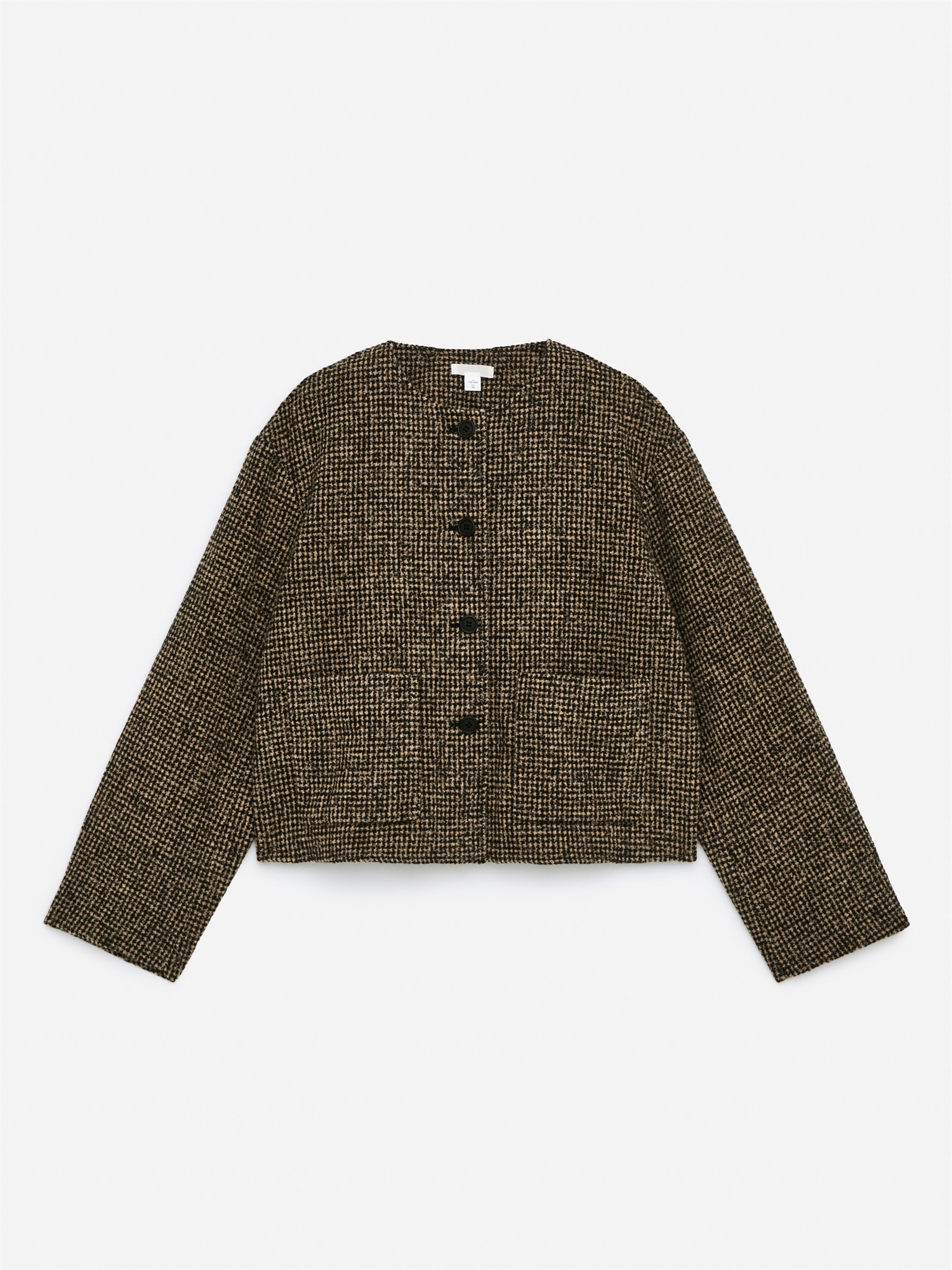 Рубашка оверсайз из шерстяной ткани. Застежка на пуговицы и накладные карманы спереди. Регулярный крой.