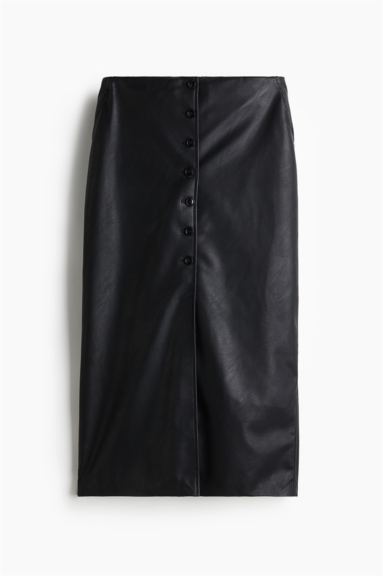 Приталенная юбка длиной до колен из ткани с покрытием, с высокой талией и пуговицами спереди. Диагональные боковые карманы, втачные задние карманы и прямой подол с высоким разрезом спереди и сзади. На подкладке.