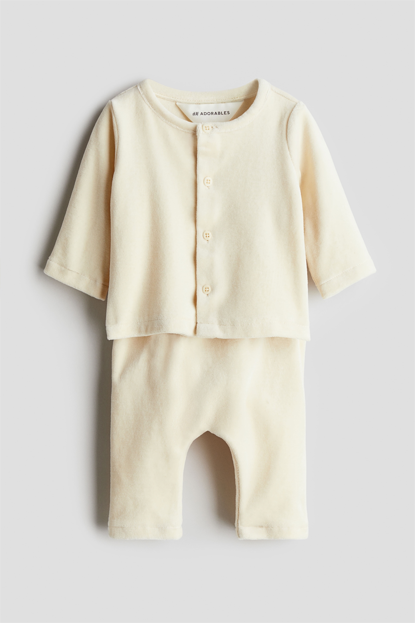H&M Adorables. Уютный комплект из топа и брюк из шелковистого мягкого велюра, изготовленного из высококачественного хлопка. Топ с длинными рукавами, круглым вырезом и пуговицами спереди. Брюки с эластичной утягивающейся талией. Коллекция H&M Adorables - это подборка удобных и качественных вещей, не теряющих актуальности.
