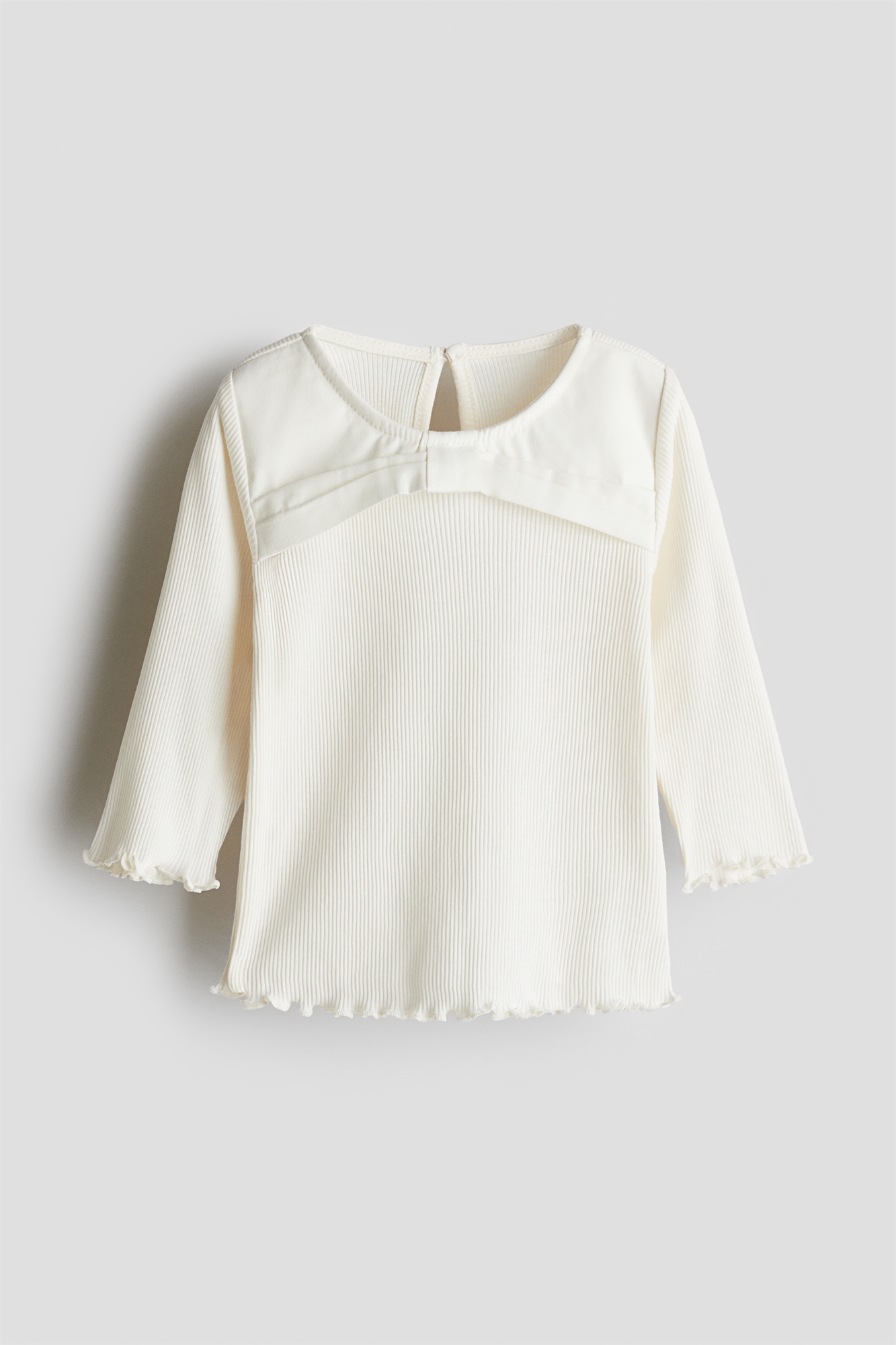 Топ из ребристого хлопкового джерси, украшенный сверху бантиком из хлопкового поплина. Круглый вырез, застежка на пуговицу сзади и длинные рукава. Манжеты и подол отделаны оверлоком.