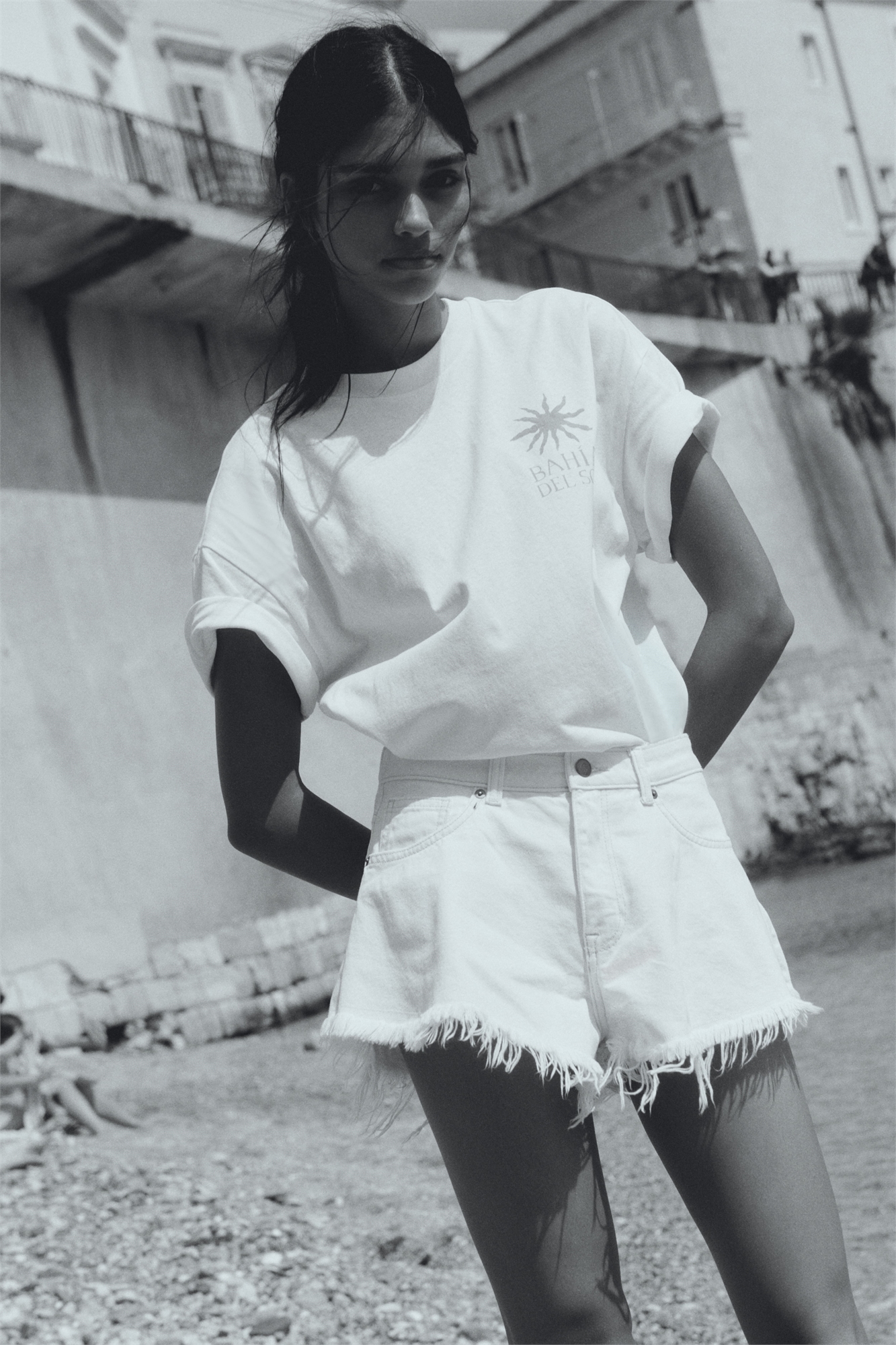 Свободные шорты с 5 карманами из жесткого хлопкового денима с высокой талией, ширинкой на молнии и пуговице и обтрепанными краями по краям.
