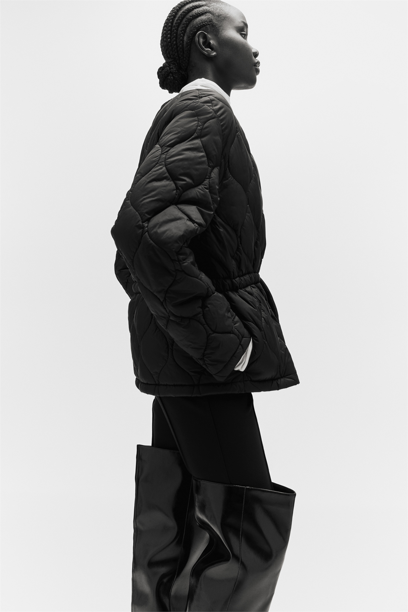 Куртка из стеганого нейлона с легкой подкладкой, круглым вырезом и застежкой-молнией спереди. Свободный крой с мягко опущенными плечами, незаметными боковыми карманами и утягивающим шнурком на талии для придания силуэту четких очертаний. На подкладке.
