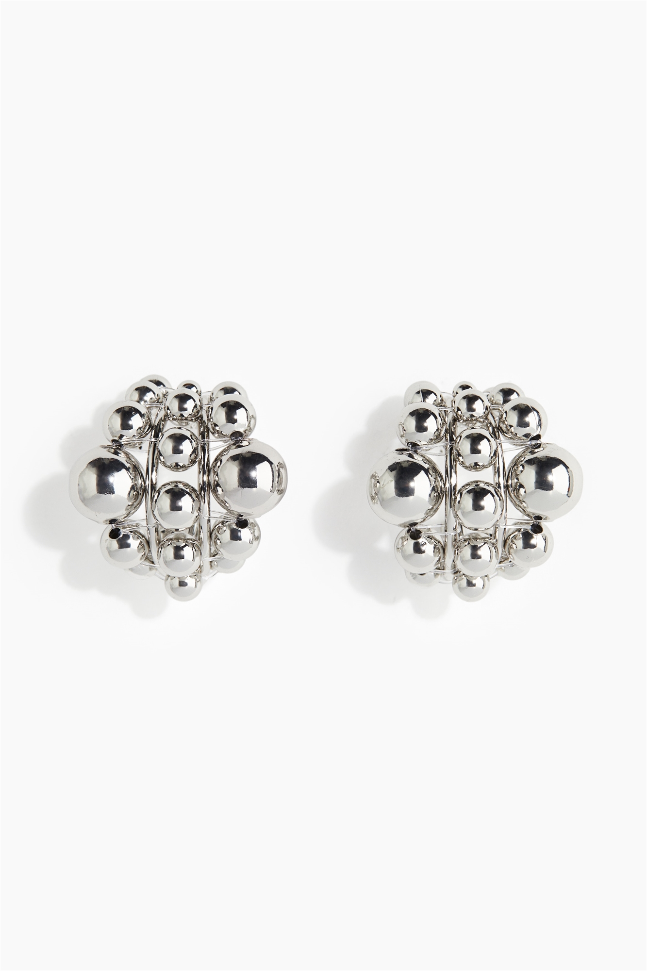 Широкие серьги-обручи с блестящими металлическими бусинами сужающегося размера. Диаметр 3 см.
