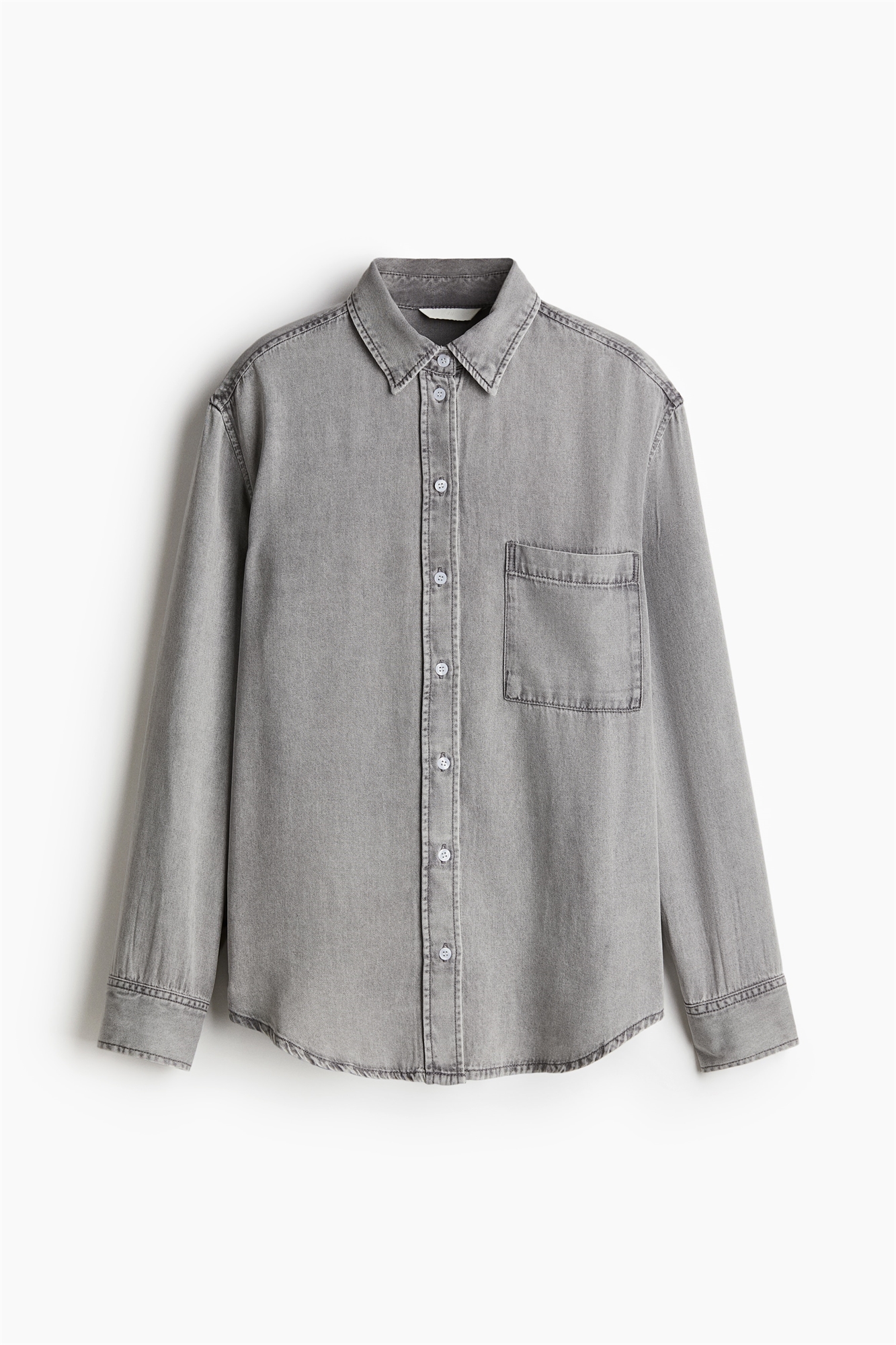Длинная рубашка свободного покроя из мягкого лиоцеллового денима с воротником, пуговицами спереди и открытым нагрудным карманом. Двухслойный верх со складками сзади, слегка опущенные плечи и длинные рукава с регулируемыми пуговицами на манжетах и рукавной планкой с пуговицей. Закругленный подол.