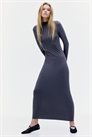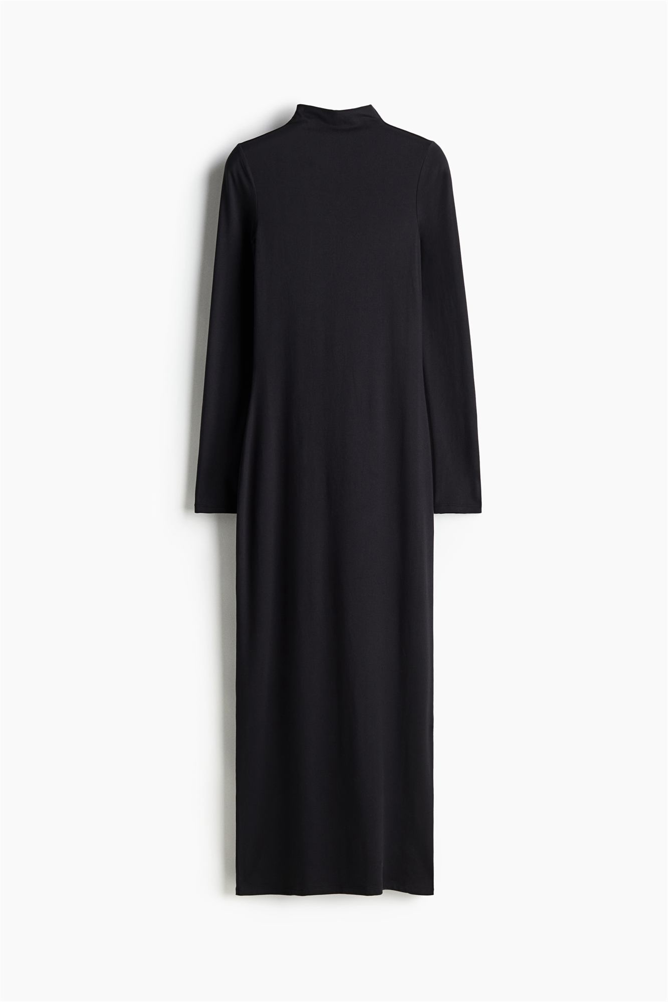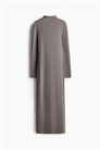 Длинное приталенное платье из эластичного трикотажа с легким блеском. Черепаховая горловина, длинные рукава и прямой подол.