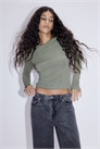 Короткий приталенный топ из эластичного трикотажа с круглым вырезом и длинными рукавами.