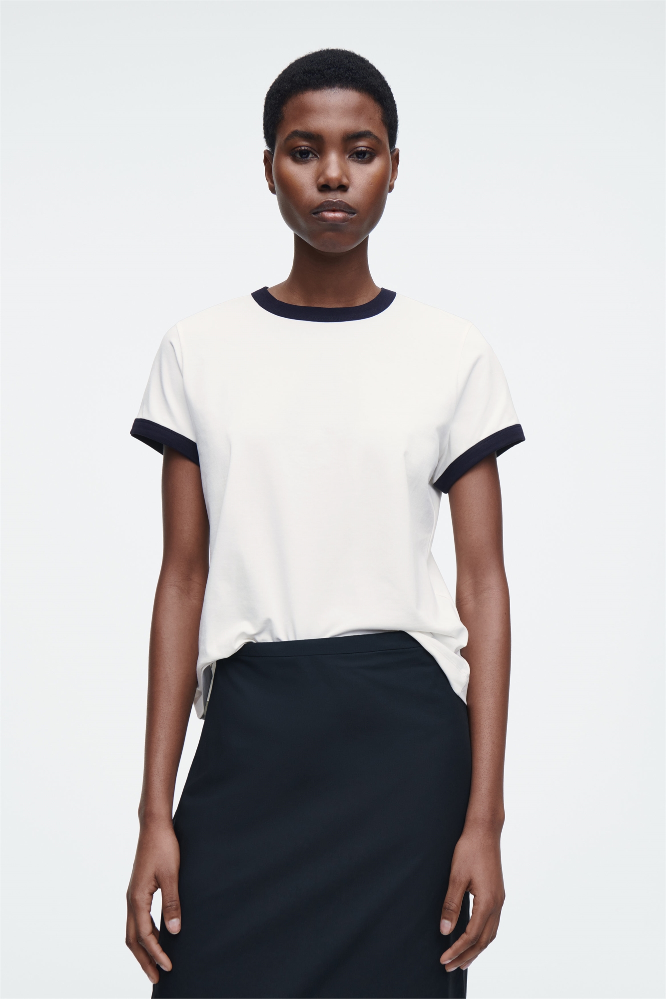 Эта футболка в стиле "рингер", навевающая ностальгию по 80-м, выполнена в уменьшенном размере и облегает тело. Она сшита из ультрамягкого хлопка небелого оттенка, имеет горловину и короткие рукава с контрастной отделкой. Наши стилисты предлагают сочетать ее с джинсами. Облегающий крой Оболочка: 92% хлопок, 8% эластан. Без учета отделки / Машинная стирка Длина по спинке для размера S составляет 58,2 см / Модель носит размер S