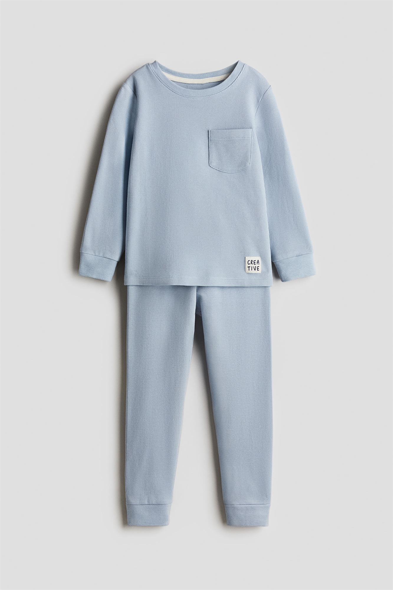 Пижама из мягкого вафельного хлопкового трикотажа. Верхняя часть с круглым вырезом, открытым накладным карманом и длинными рукавами с манжетами. Низ с эластичной талией и манжетами по краям.