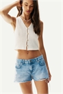 Шорты с 5 карманами из жесткого хлопкового денима с изношенными деталями и необработанными краями. Заниженная талия, ширинка на молнии и пуговице.