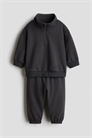 Комплект из топа и джоггеров из толстовки с мягкой начесанной внутренней стороной. Топ с воротником-стойкой, застежкой на молнию, спущенными плечами и длинными рукавами. Ребристые манжеты и подол. Джоггеры с эластичной утягивающейся талией и эластичными вставками на подоле.