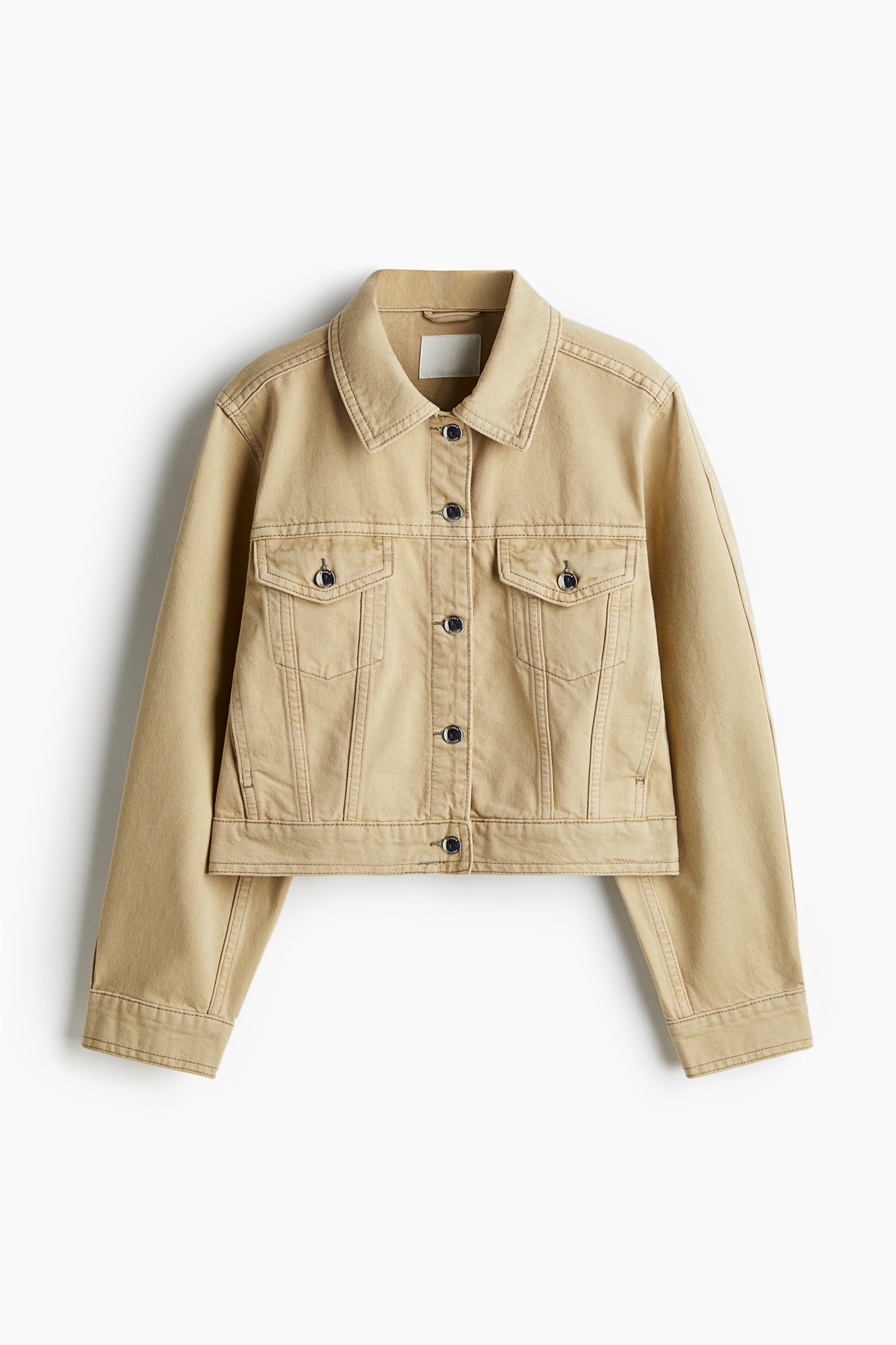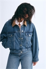 Куртка свободного покроя из хлопкового денима с воротником и металлическими пуговицами спереди. Спереди и сзади иголки, слегка спущенные плечи и манжеты на пуговицах. Небрежные боковые карманы и нагрудные карманы с клапаном на пуговице.