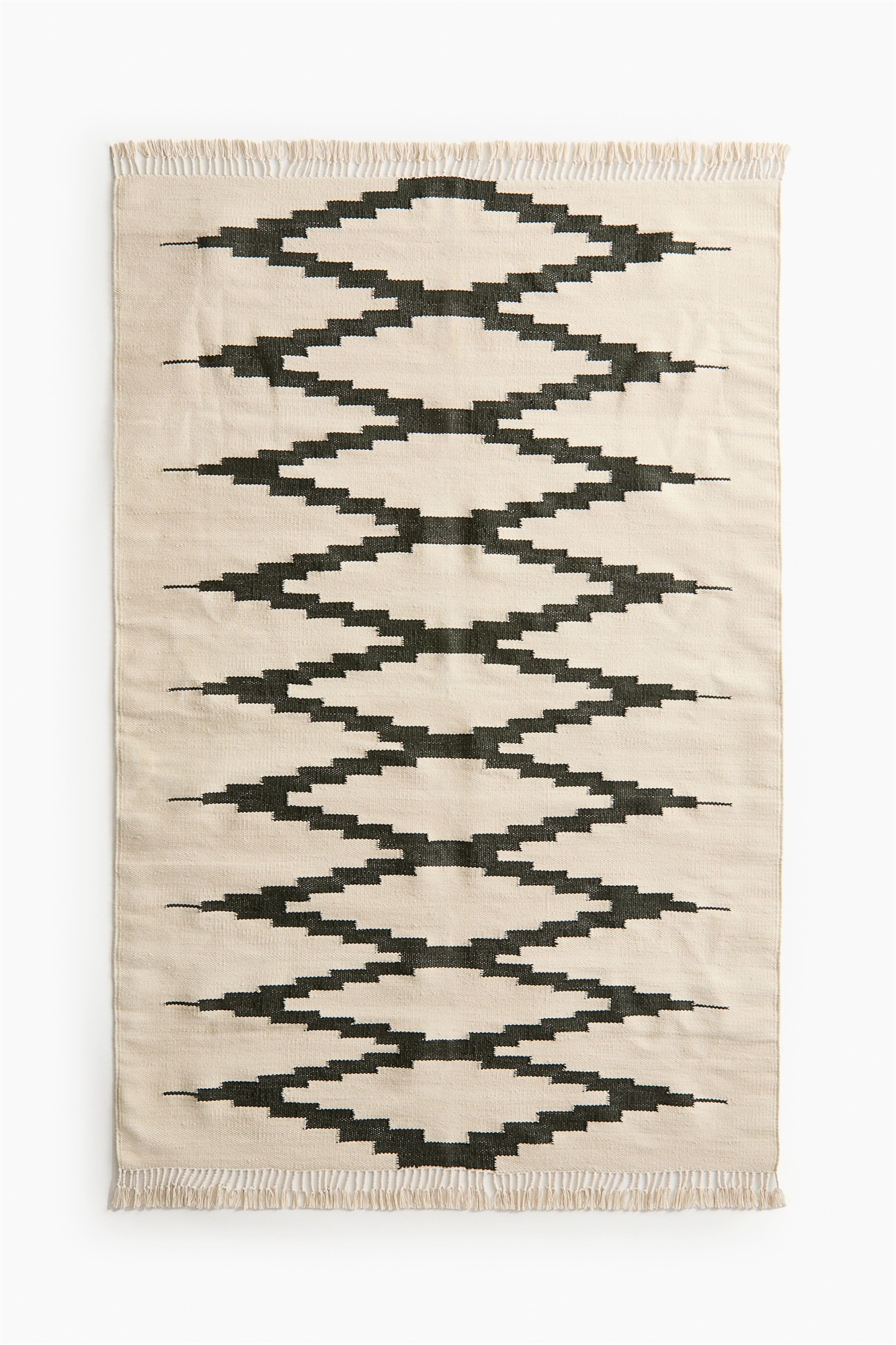 Ковер из шерстяной смеси с деревенским узором и бахромой на коротких сторонах.