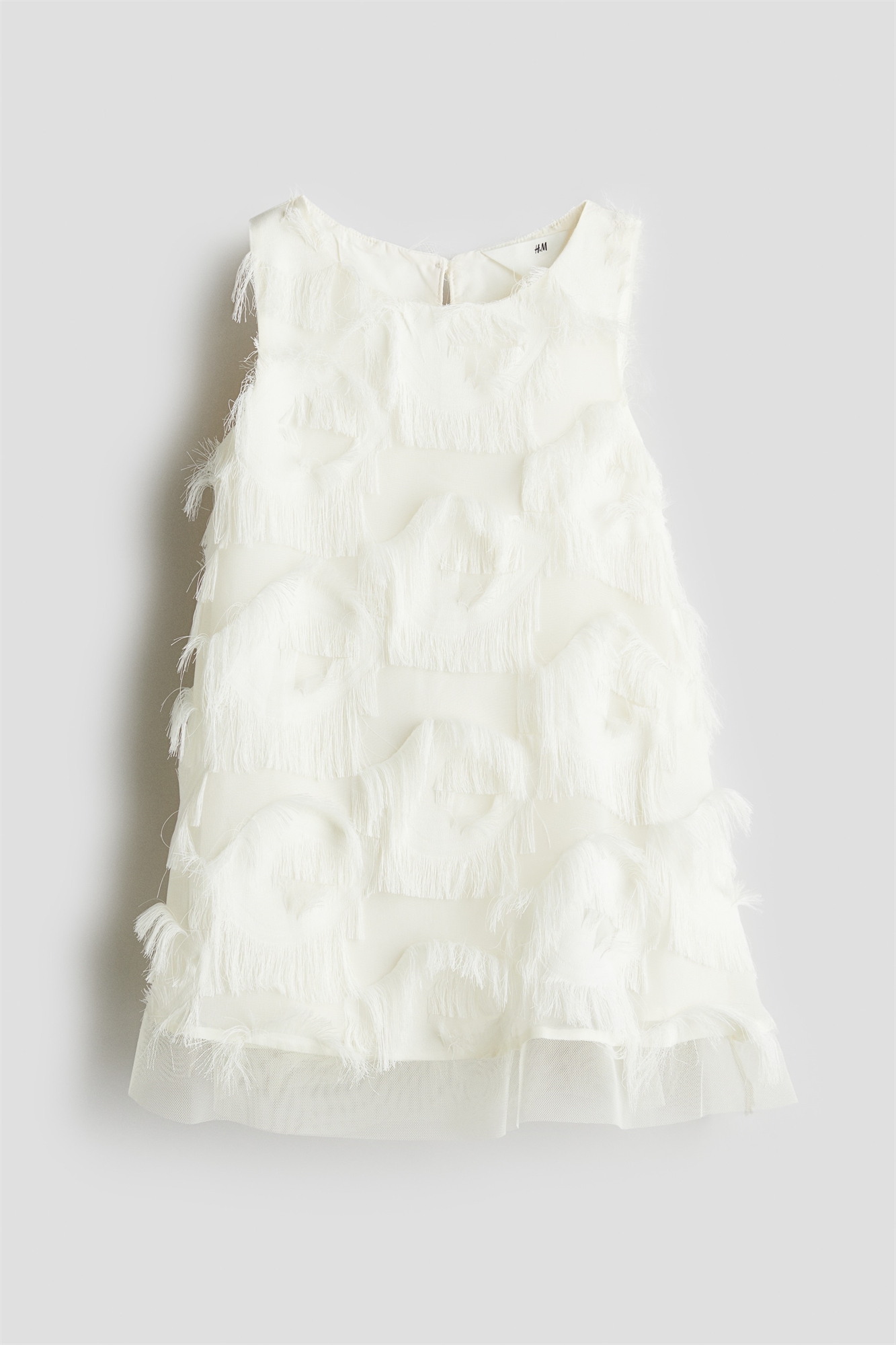 Платье А-силуэта из тканого материала с круглым вырезом и застежкой на пуговицу сзади. На подкладке.
