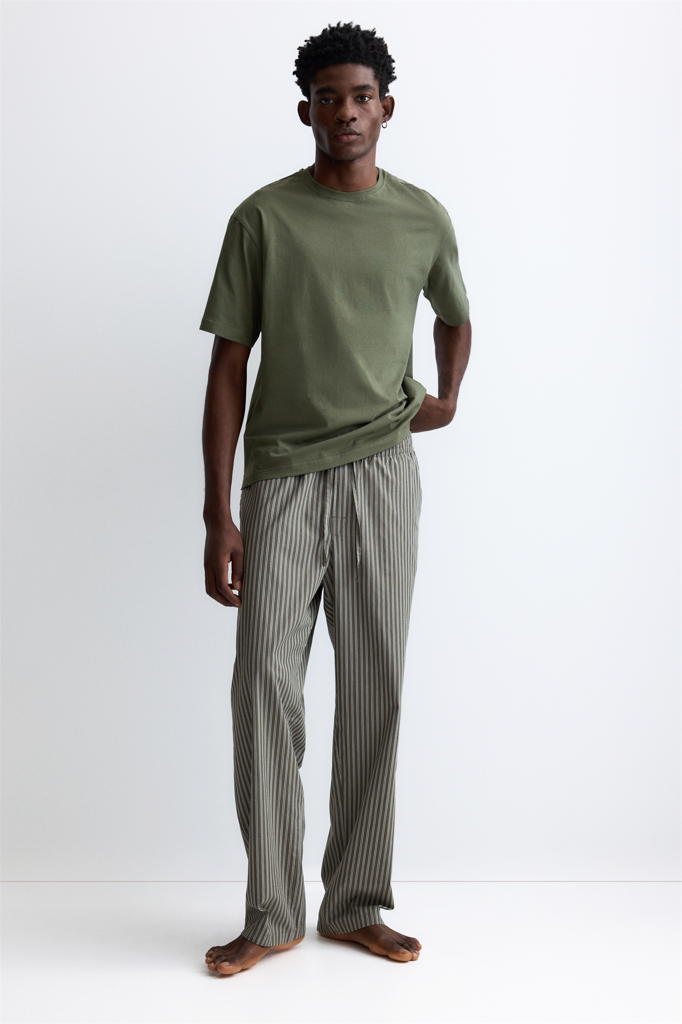 Пижама с футболкой из легкого хлопкового джерси и нижним бельем из хлопкового поплина. Футболка с круглым вырезом с ребристой отделкой и прямым подолом с разрезом с каждой стороны. Низ с эластичным утягивающим поясом, фальшивой ширинкой и боковыми карманами.