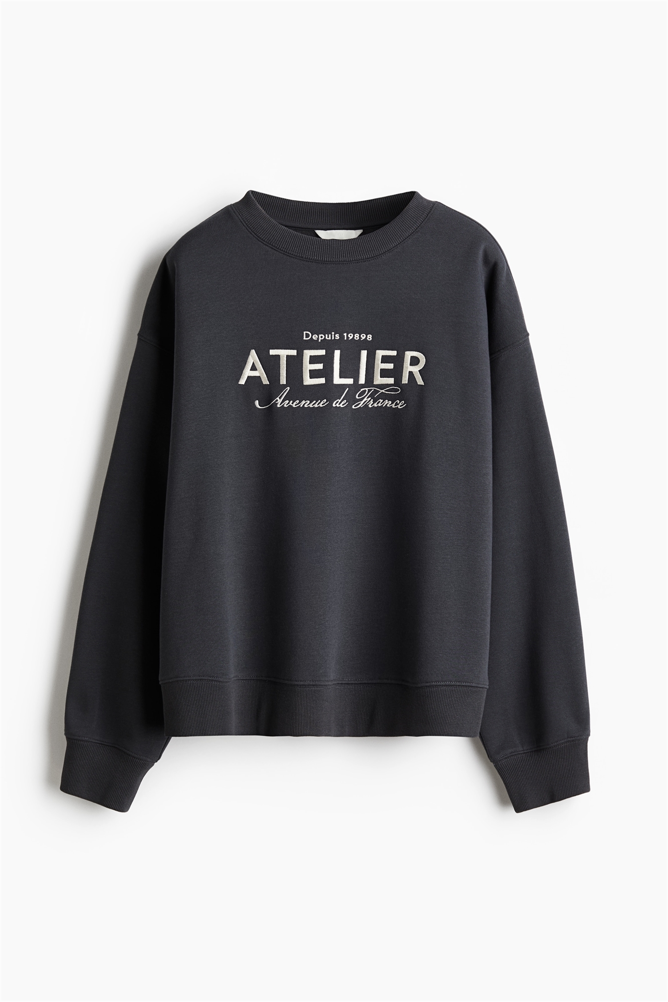 Свитшот оверсайз из футера с мягким начесом внутри и текстовым рисунком спереди. Круглый вырез с ребристой отделкой, спущенные плечи и длинные рукава. Ребристые манжеты и подол.