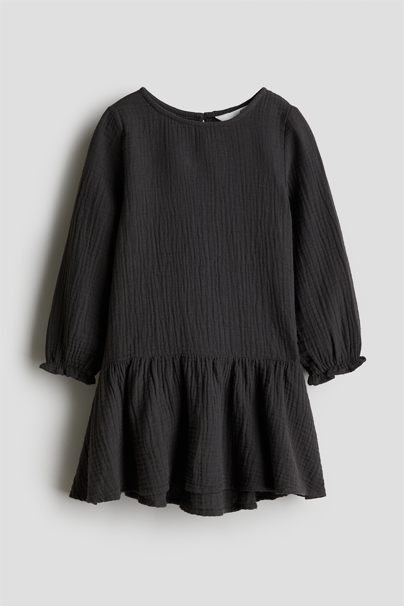 Платье с длинными рукавами из мягкого хлопкового муслина с круглым вырезом, отверстием для ключа с пуговицей сзади и длинными пышными рукавами с эластичными манжетами с оборками. Присборенный шов ниже талии и объемная юбка, удлиненная сзади.