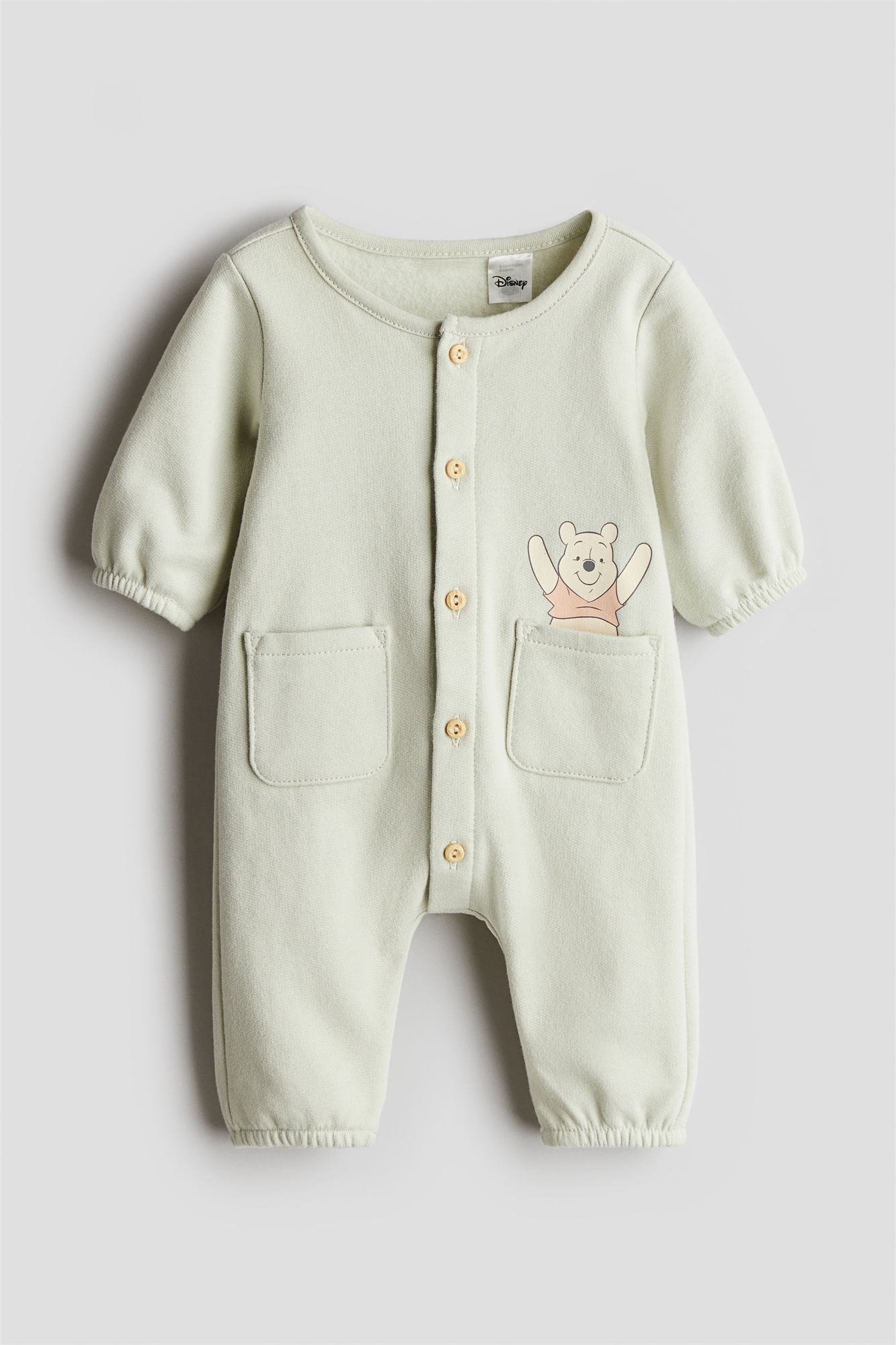 Ромпер из хлопковой толстовки с мягким начесом внутри и принтом спереди. Круглый вырез, застежка на пуговицы спереди и накладные передние карманы. Эластичные манжеты и манжеты на кайме.